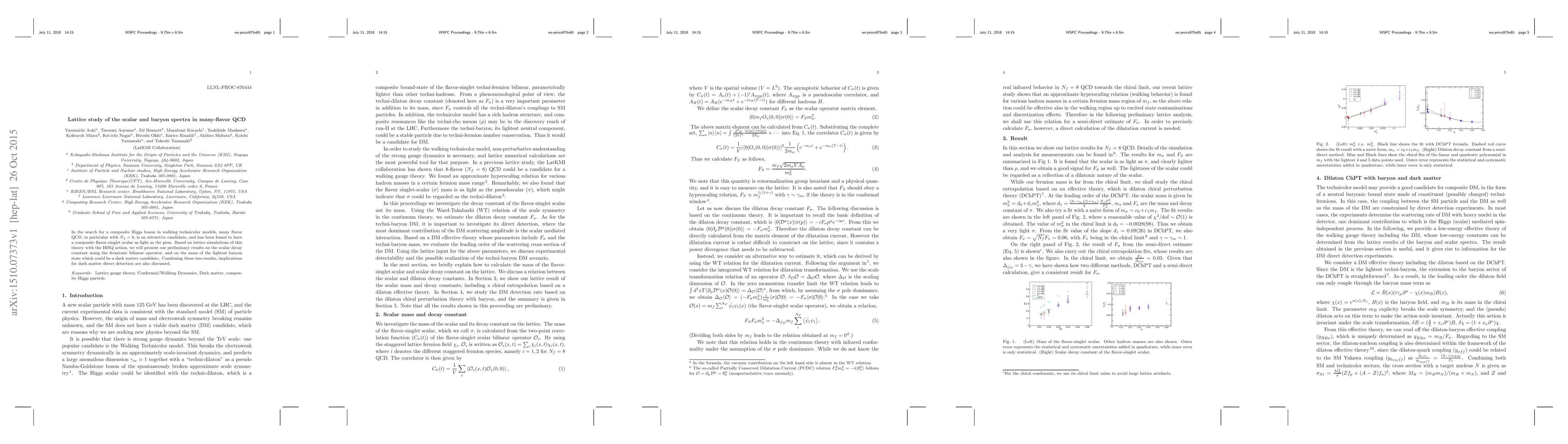 In the search for a composite Higgs boson in walking technicolor models, many flavor QCD, in particular with $N_f=8$, is an attractive candidate, and has been found to have a composite flavor-singlet scalar as light as the pion. Based on lattice simulations of this theory with the HISQ action, we will present our preliminary results on the scalar decay constant using the fermionic bilinear operator, and on the mass of the lightest baryon state which could be a dark matter candidate. Combining these two results, implications for dark matter direct detection are also discussed.