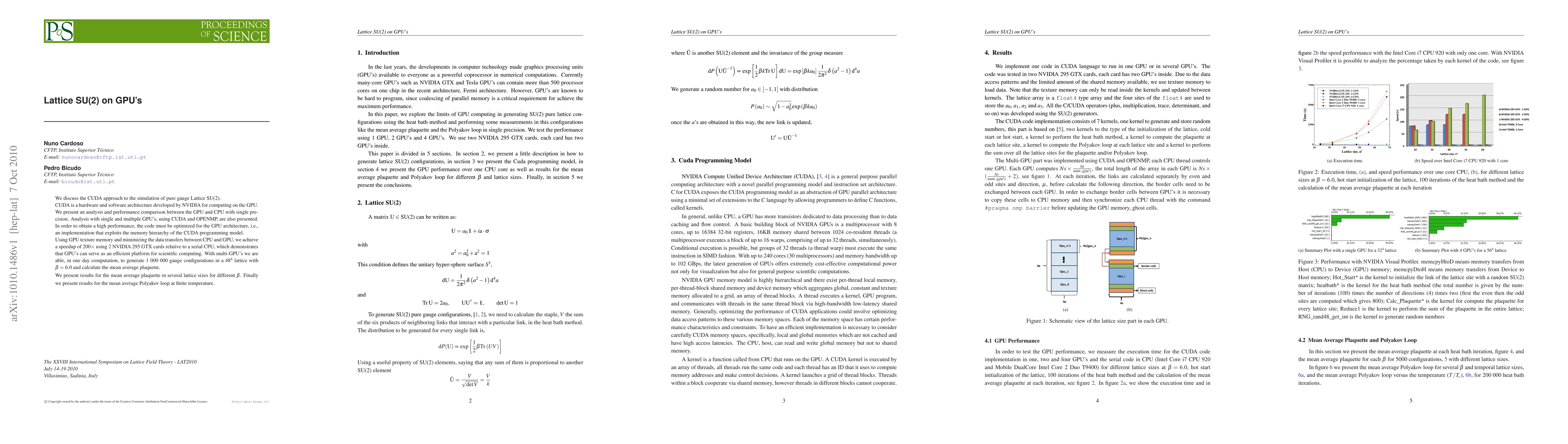 We discuss the CUDA approach to the simulation of pure gauge Lattice SU(2). CUDA is a hardware and software architecture developed by NVIDIA for computing on the GPU. We present an analysis and performance comparison between the GPU and CPU with single precision. Analysis with single and multiple GPU's, using CUDA and OPENMP, are also presented. In order to obtain a high performance, the code must be optimized for the GPU architecture, i.e., an implementation that exploits the memory hierarchy of the CUDA programming model. Using GPU texture memory and minimizing the data transfers between CPU and GPU, we achieve a speedup of $200\times$ using 2 NVIDIA 295 GTX cards relative to a serial CPU, which demonstrates that GPU's can serve as an efficient platform for scientific computing. With multi-GPU's we are able, in one day computation, to generate 1 000 000 gauge configurations in a $48^4$ lattice with $\beta=6.0$ and calculate the mean average plaquette. We present results for the mean average plaquette in several lattice sizes for different $\beta$. Finally we present results for the mean average Polyakov loop at finite temperature.