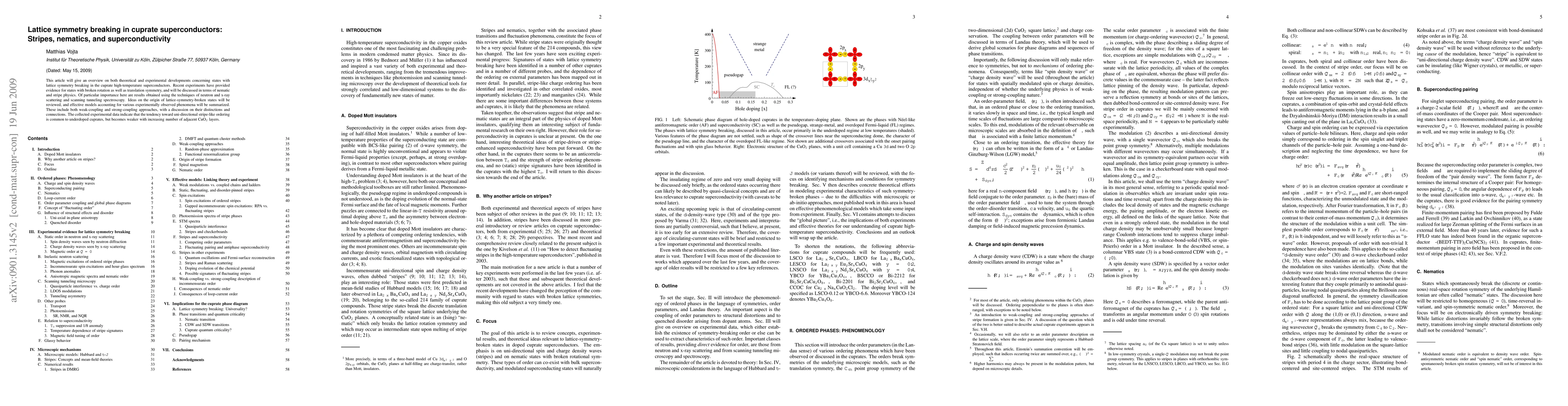 This article will give an overview on both theoretical and experimental developments concerning states with lattice symmetry breaking in the cuprate high-temperature superconductors. Recent experiments have provided evidence for states with broken rotation as well as translation symmetry, and will be discussed in terms of nematic and stripe physics. Of particular importance here are results obtained using the techniques of neutron and x-ray scattering and scanning tunneling spectroscopy. Ideas on the origin of lattice-symmetry-broken states will be reviewed, and effective models accounting for various experimentally observed phenomena will be summarized. These include both weak-coupling and strong-coupling approaches, with a discussion on their distinctions and connections. The collected experimental data indicate that the tendency toward uni-directional stripe-like ordering is common to underdoped cuprates, but becomes weaker with increasing number of adjacent CuO_2 layers.