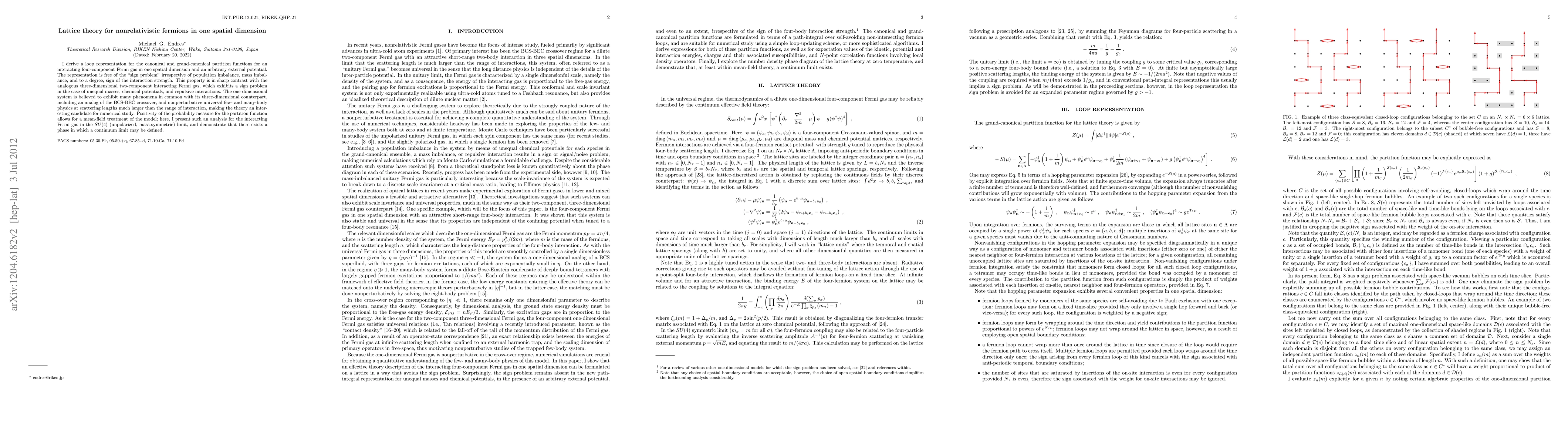 I derive a loop representation for the canonical and grand-canonical partition functions for an interacting four-component Fermi gas in one spatial dimension and an arbitrary external potential. The representation is free of the "sign problem" irrespective of population imbalance, mass imbalance, and to a degree, sign of the interaction strength. This property is in sharp contrast with the analogous three-dimensional two-component interacting Fermi gas, which exhibits a sign problem in the case of unequal masses, chemical potentials, and repulsive interactions. The one-dimensional system is believed to exhibit many phenomena in common with its three-dimensional counterpart, including an analog of the BCS-BEC crossover, and nonperturbative universal few- and many-body physics at scattering lengths much larger than the range of interaction, making the theory an interesting candidate for numerical study. Positivity of the probability measure for the partition function allows for a mean-field treatment of the model; here, I present such an analysis for the interacting Fermi gas in the SU(4) (unpolarized, mass-symmetric) limit, and demonstrate that there exists a phase in which a continuum limit may be defined.