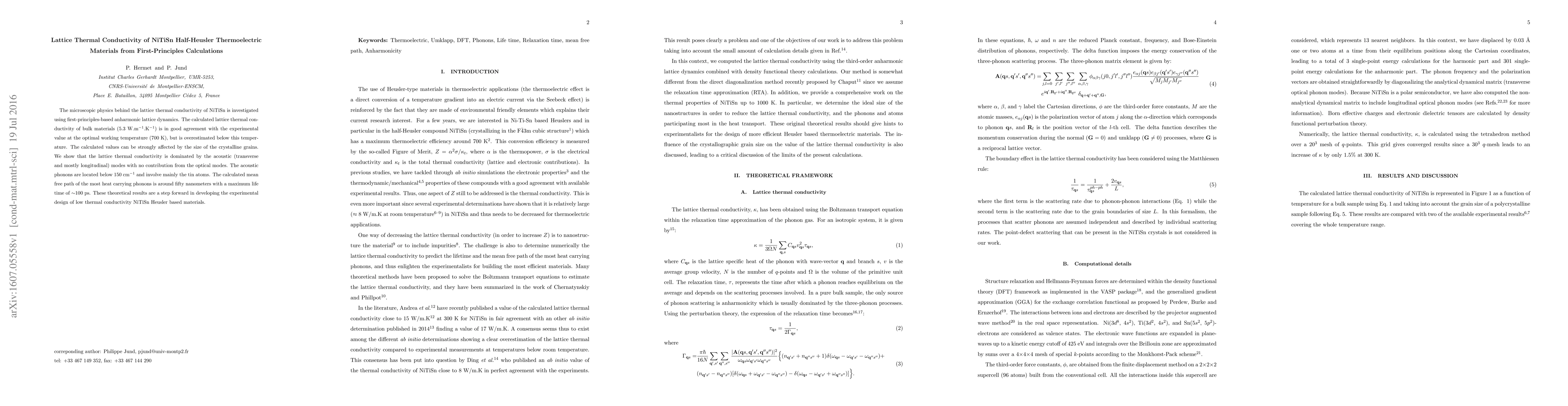 This study employs first-principles calculations to explore the lattice thermal conductivity of NiTiSn thermoelectric materials, finding good agreement with experimental data at 700 K, and identifies acoustic phonons below 150 cm-1, primarily involving tin atoms, as the main contributors. The results provide insights for designing NiTiSn-based materials with reduced thermal conductivity.