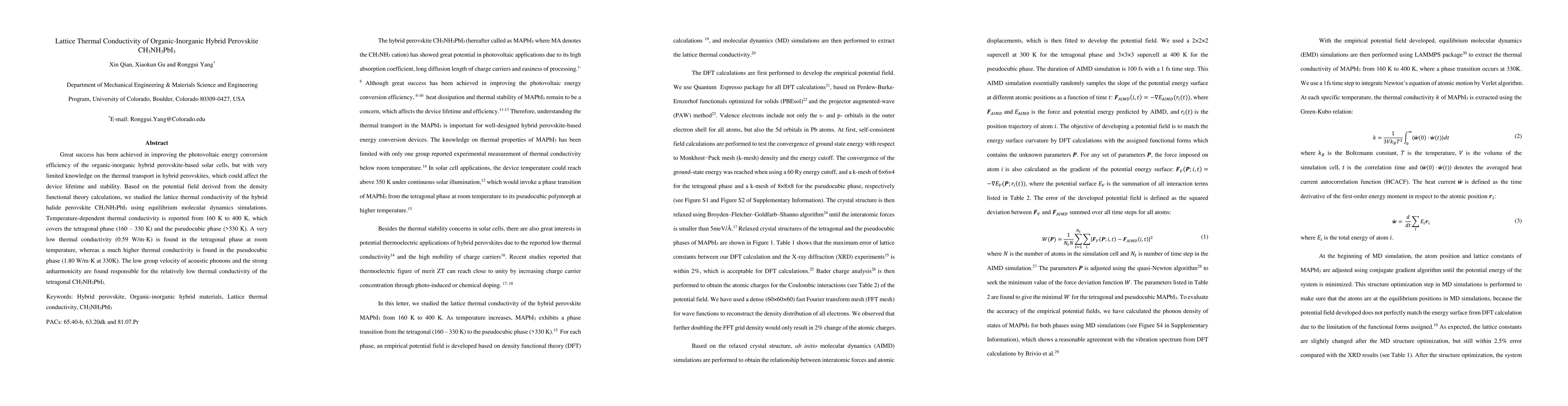 This study investigates the lattice thermal conductivity of the organic-inorganic hybrid perovskite CH3NH3PbI3 using density functional theory and molecular dynamics simulations. It finds low thermal conductivity (0.50 W/mK) in the tetragonal phase and higher conductivity (1.80 W/mK at 330 K) in the pseudocubic phase, attributed to low acoustic phonon group velocity and strong anharmonicity.