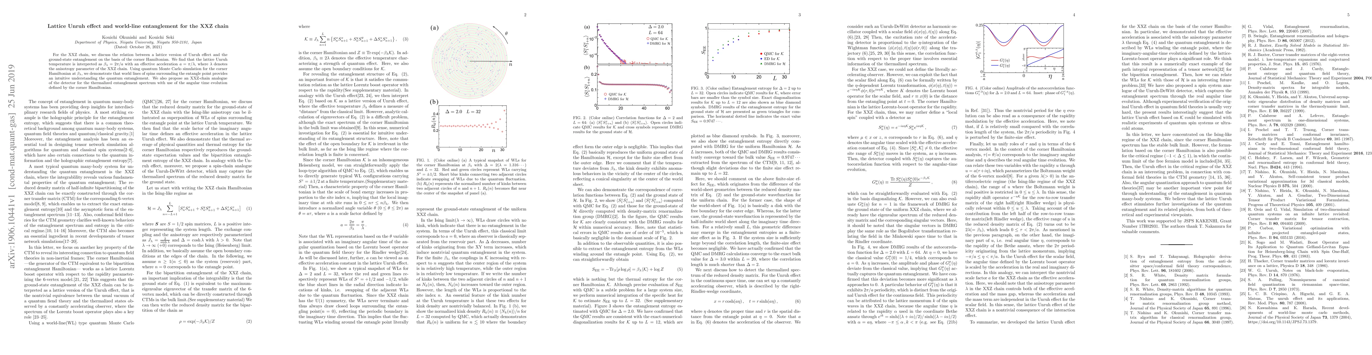 This paper explores the connection between a lattice version of the Unruh effect and ground-state entanglement in the XXZ chain, finding that the lattice Unruh temperature is $\beta_\lambda = 2\pi/a$ with effective acceleration $a=\pi/\lambda$. Quantum Monte Carlo simulations reveal that spin world lines around the entanglement point offer insight into quantum entanglement, and the authors propose an XXZ-chain analogue for the thermalized entanglement spectrum.