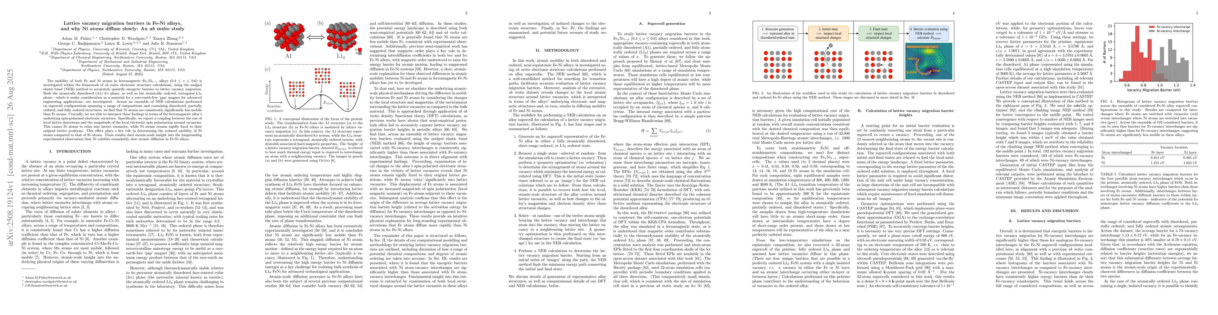The mobility of both Fe and Ni atoms in ferromagnetic $\textrm{Fe}_x \textrm{Ni}_{1-x}$ alloys ($0.4 \leq x \leq 0.6$) is investigated within the framework of ab initio electronic structure calculations, using the nudged elastic band (NEB) method to accurately quantify energetic barriers to lattice vacancy migration. Both the atomically disordered ($A1$) fcc phase, as well as the atomically ordered, tetragonal $\textrm{L}1_0$ phase - which is under consideration as a material for a rare-earth-free 'gap' magnet for advanced engineering applications - are investigated. Across an ensemble of NEB calculations performed on supercell configurations spanning a range of compositions and containing disordered, partially ordered, and fully ordered structures, we find that Ni atoms are consistently significantly less mobile than Fe atoms. Crucially, we are able to interpret these findings in terms of the ferromagnetic alloy's underlying spin-polarised electronic structure. Specifically, we report a coupling between the size of local lattice distortions and the magnitude of the local electronic spin polarisation around vacancies. This causes Fe atoms to relax into lattice vacancies, while Ni atoms remain rigidly fixed to their original lattice positions. This effect plays a key role in determining the reduced mobility of Ni atoms compared to that of Fe atoms. These results shed atomic-scale insight into the longstanding experimental observation that Ni exhibits remarkably slow atomic diffusion in Fe-Ni alloys.