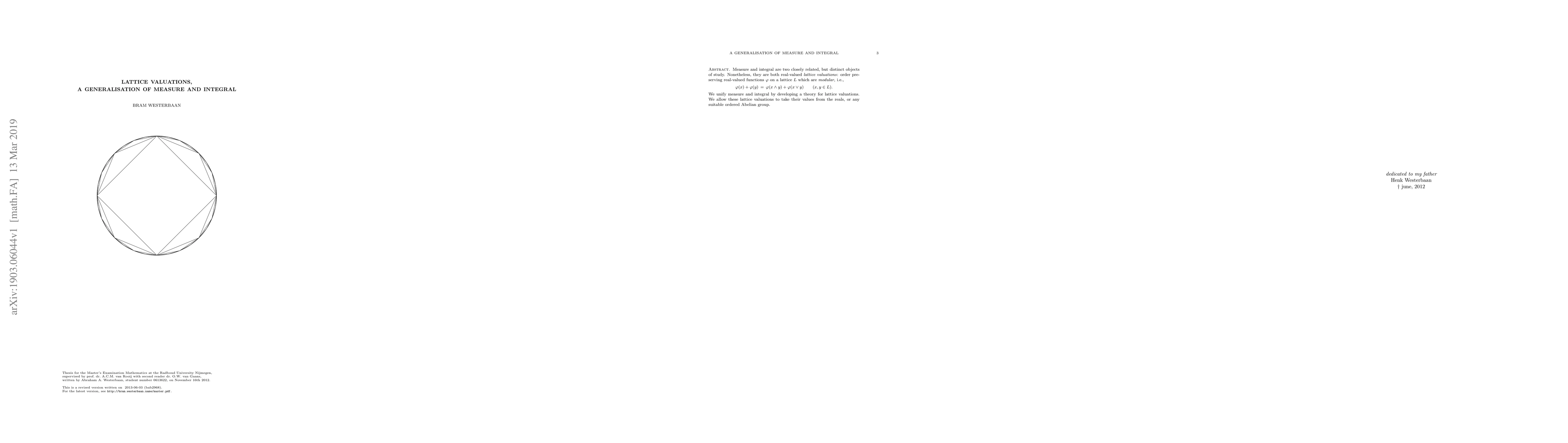 This paper generalizes measure and integral by introducing lattice valuations, which are order-preserving functions on a lattice that satisfy a modular property. It unifies these concepts by extending the theory to valuations taking values in any ordered Abelian group.