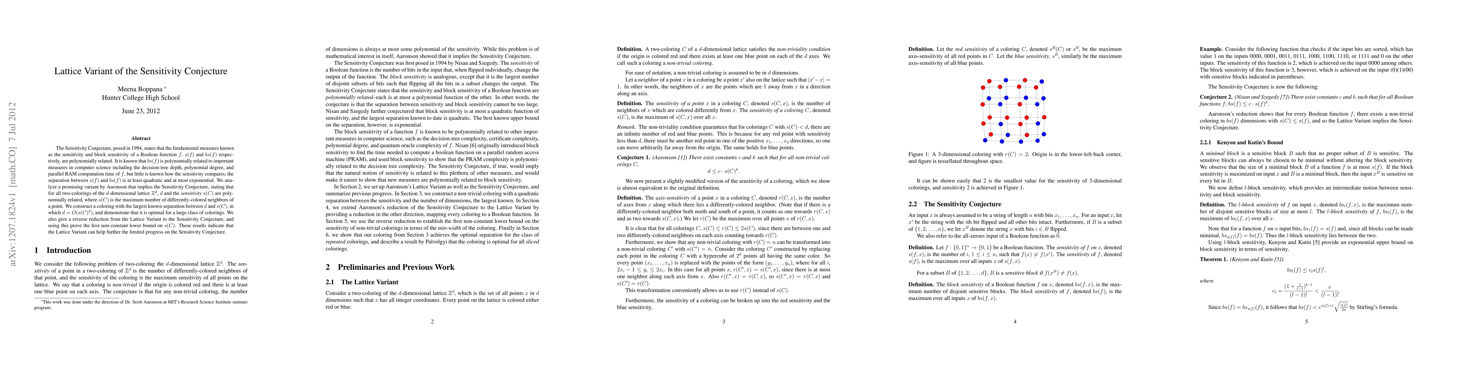 The Sensitivity Conjecture, posed in 1994, states that the fundamental measures known as the sensitivity and block sensitivity of a Boolean function f, s(f) and bs(f) respectively, are polynomially related. It is known that bs(f) is polynomially related to important measures in computer science including the decision-tree depth, polynomial degree, and parallel RAM computation time of f, but little is known how the sensitivity compares; the separation between s(f) and bs(f) is at least quadratic and at most exponential. We analyze a promising variant by Aaronson that implies the Sensitivity Conjecture, stating that for all two-colorings of the d-dimensional lattice $\mathbb{Z}^d$, d and the sensitivity s(C) are polynomially related, where s(C) is the maximum number of differently-colored neighbors of a point. We construct a coloring with the largest known separation between d and s(C), in which $d=O(s(C)^2)$, and demonstrate that it is optimal for a large class of colorings. We also give a reverse reduction from the Lattice Variant to the Sensitivity Conjecture, and using this prove the first non-constant lower bound on s(C). These results indicate that the Lattice Variant can help further the limited progress on the Sensitivity Conjecture.
