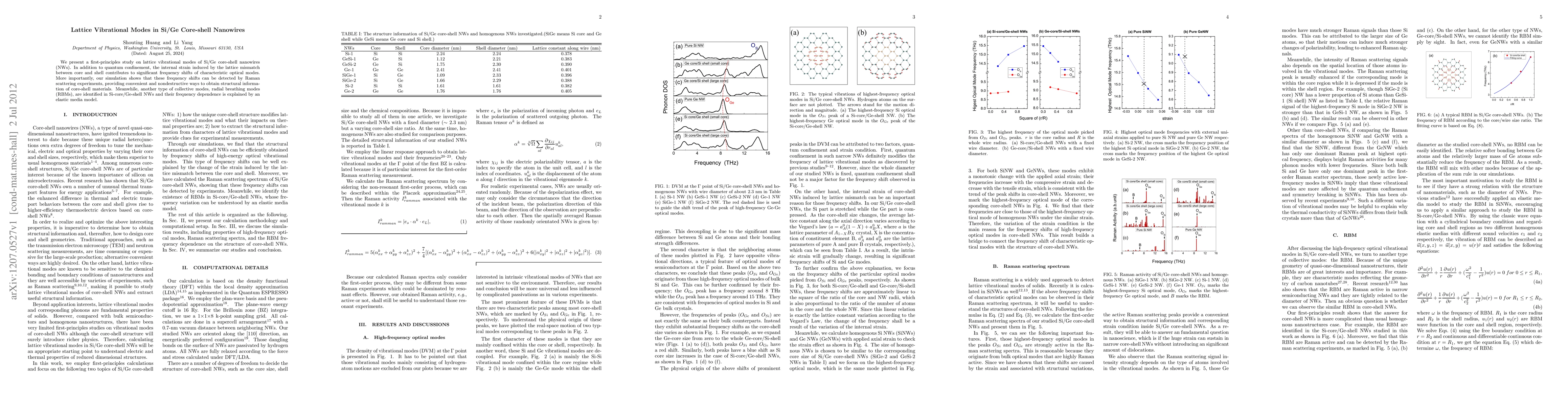 This study investigates lattice vibrational modes in Si/Ge core-shell nanowires, revealing significant frequency shifts due to internal strain and quantum confinement. Raman scattering can detect these shifts, offering a nondestructive method for structural analysis, and identifies radial breathing modes with frequency dependence explained by an elastic model.