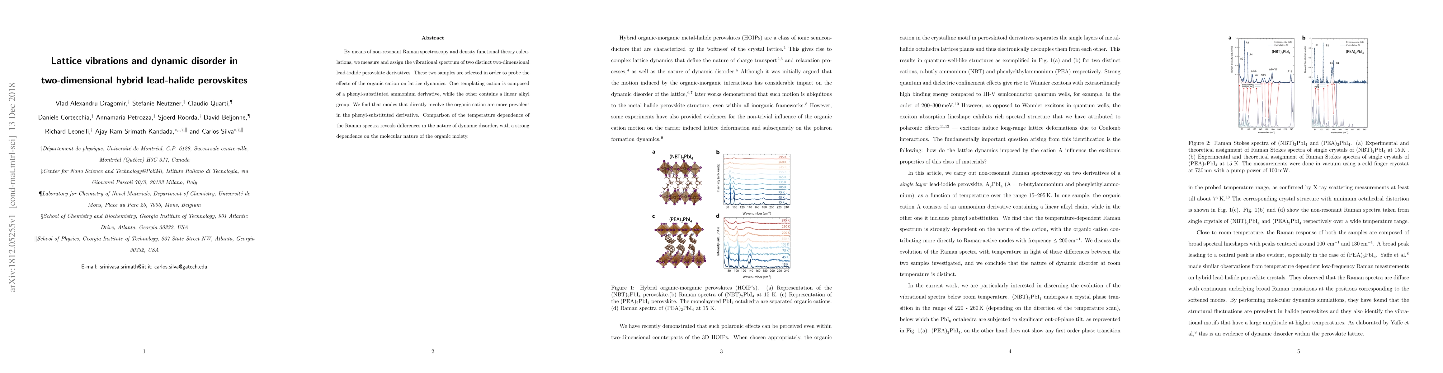 Researchers studied lattice vibrations and disorder in two-dimensional lead-iodide perovskites using Raman spectroscopy and density functional theory calculations. They found that the organic cation affects lattice dynamics and dynamic disorder, with differences depending on its molecular nature.