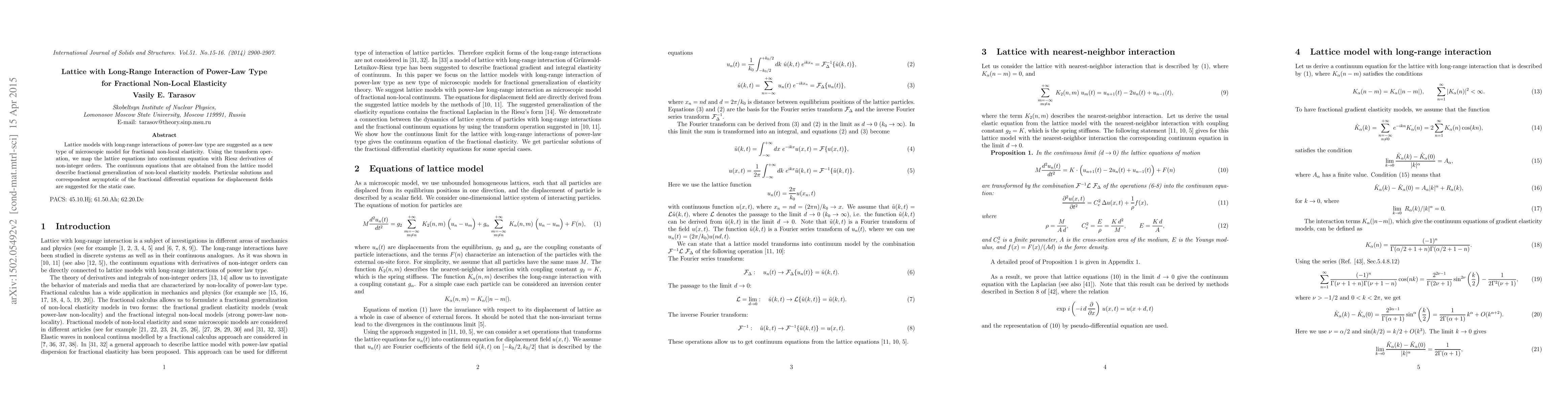 This paper proposes a lattice model with long-range power-law interactions to describe fractional non-local elasticity. It transforms the lattice equations into continuum equations using Riesz derivatives, providing a fractional generalization of non-local elasticity models and suggesting particular solutions for static displacement fields.