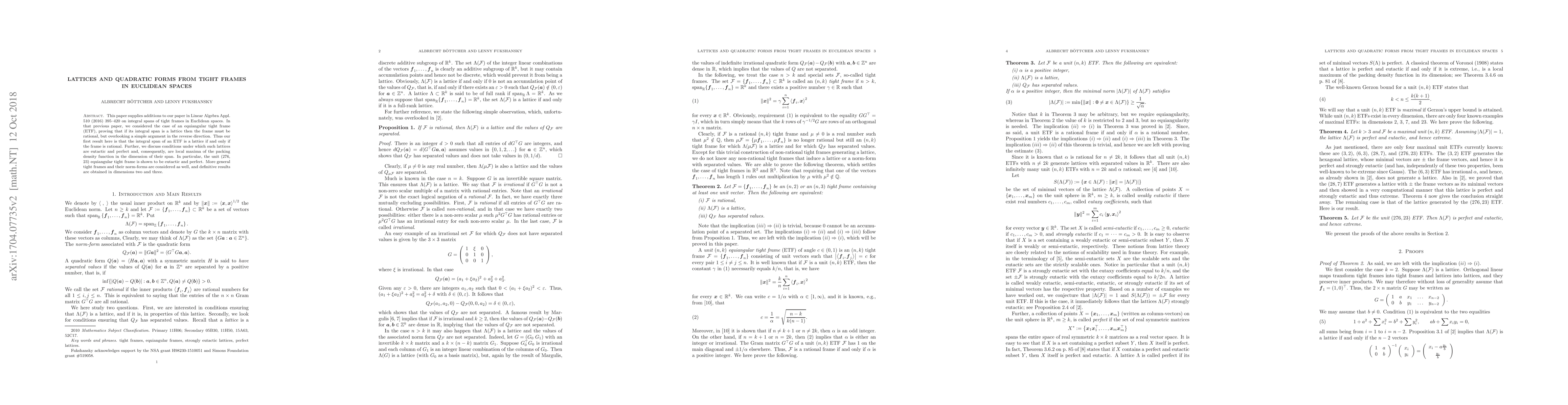 This paper supplies additions to our paper in Linear Algebra Appl. 510 (2016) 395--420 on integral spans of tight frames in Euclidean spaces. In that previous paper, we considered the case of an equiangular tight frame (ETF), proving that if its integral span is a lattice then the frame must be rational, but overlooking a simple argument in the reverse direction. Thus our first result here is that the integral span of an ETF is a lattice if and only if the frame is rational. Further, we discuss conditions under which such lattices are eutactic and perfect and, consequently, are local maxima of the packing density function in the dimension of their span. In particular, the unit (276, 23) equiangular tight frame is shown to be eutactic and perfect. More general tight frames and their norm-forms are considered as well, and definitive results are obtained in dimensions two and three.