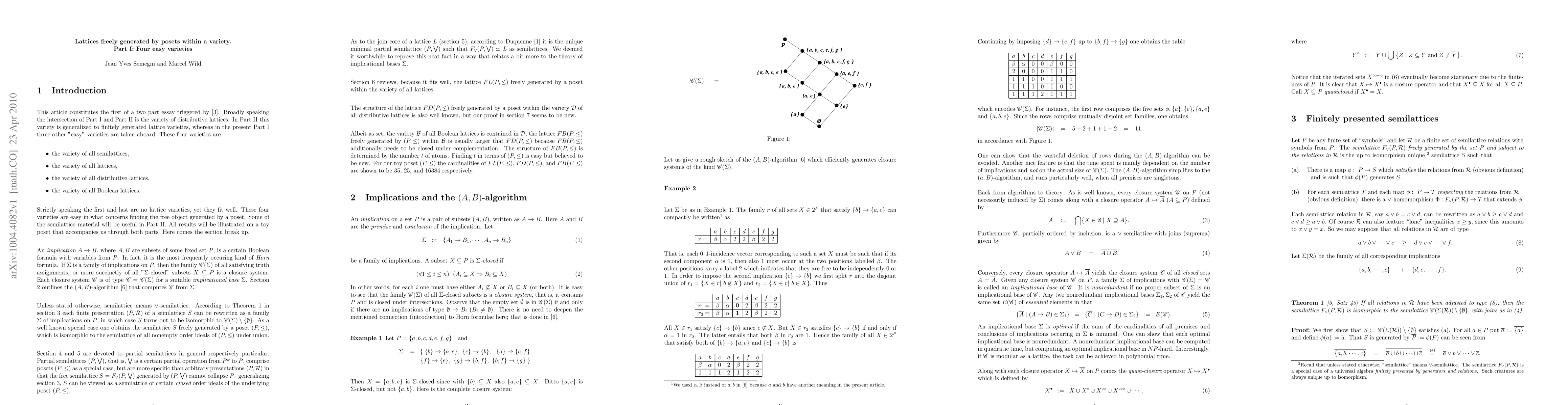 We introduce an algorithm for computing closure systems derived from a family of implications on a set. Semilattices presentations are explored and used in conjunction with the algorithm to compute various types of lattices freely generated by partially ordered sets within four easy varieties.