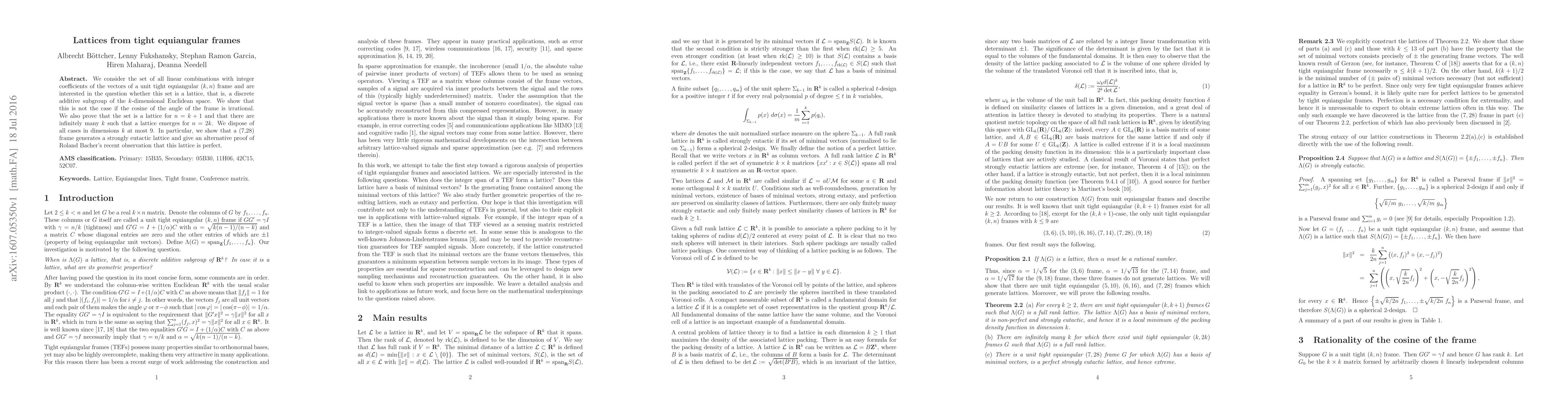 We consider the set of all linear combinations with integer coefficients of the vectors of a unit tight equiangular $(k,n)$ frame and are interested in the question whether this set is a lattice, that is, a discrete additive subgroup of the $k$-dimensional Euclidean space. We show that this is not the case if the cosine of the angle of the frame is irrational. We also prove that the set is a lattice for $n = k+1$ and that there are infinitely many $k$ such that a lattice emerges for $n = 2k$. We dispose of all cases in dimensions $k$ at most $9$. In particular, we show that a $(7,28)$ frame generates a strongly eutactic lattice and give an alternative proof of Roland Bacher's recent observation that this lattice is perfect.