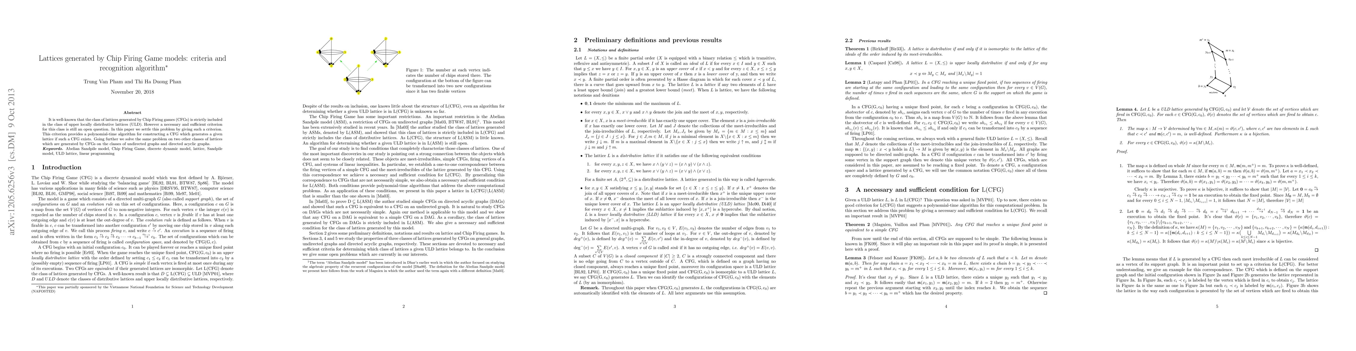 It is well-known that the class of lattices generated by Chip Firing games (CFGs) is strictly included in the class of upper locally distributive lattices (ULD). However a necessary and sufficient criterion for this class is still an open question. In this paper we settle this problem by giving such a criterion. This criterion provides a polynomial-time algorithm for constructing a CFG which generates a given lattice if such a CFG exists. Going further we solve the same problem on two other classes of lattices which are generated by CFGs on the classes of undirected graphs and directed acyclic graphs.