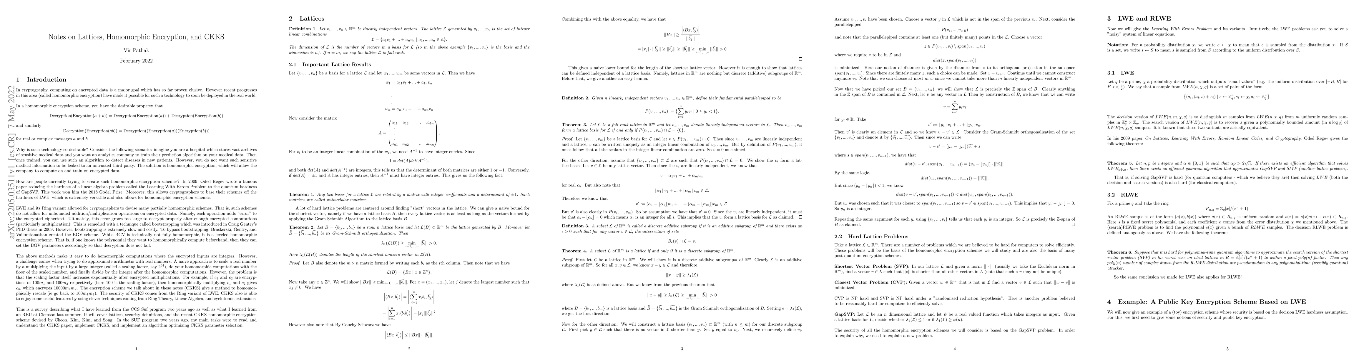 This paper surveys lattice-based cryptography and homomorphic encryption, focusing on lattice problems LWE and RLWE, and the reductions by Regev and Peikert. It also thoroughly examines the CKKS homomorphic encryption scheme with practical examples.