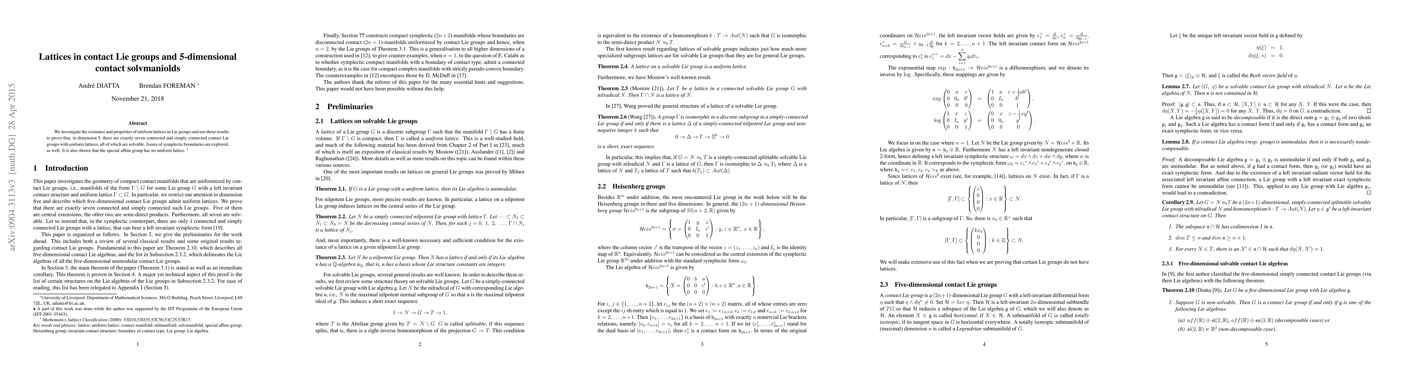 This paper explores the geometry of compact contact manifolds uniformized by contact Lie groups, proving that there are seven connected and simply connected 5-dimensional contact Lie groups with uniform lattices, all solvable. It also examines Alexander's criteria for lattice existence on solvable Lie groups and addresses issues of symplectic boundaries.