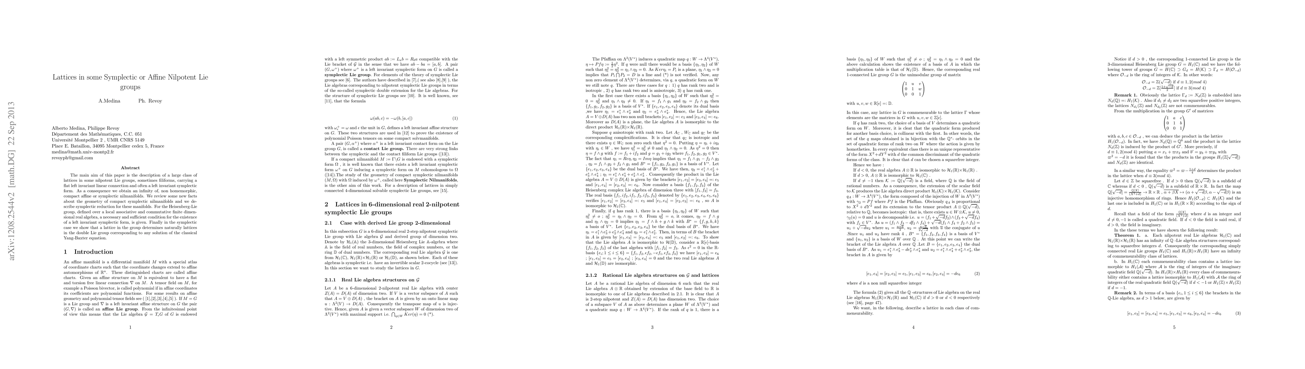 This paper explores lattices in specific nilpotent Lie groups, including filiformes, equipped with flat left invariant connections and often left invariant symplectic forms, resulting in an abundance of non-homeomorphic compact affine or symplectic manifolds. It also discusses the geometry of compact symplectic nilmanifolds and symplectic reduction, providing a condition for the existence of a left invariant symplectic form in the Heisenberg Lie group and linking lattices in these groups to solutions of the classical Yang-Baxter equation.