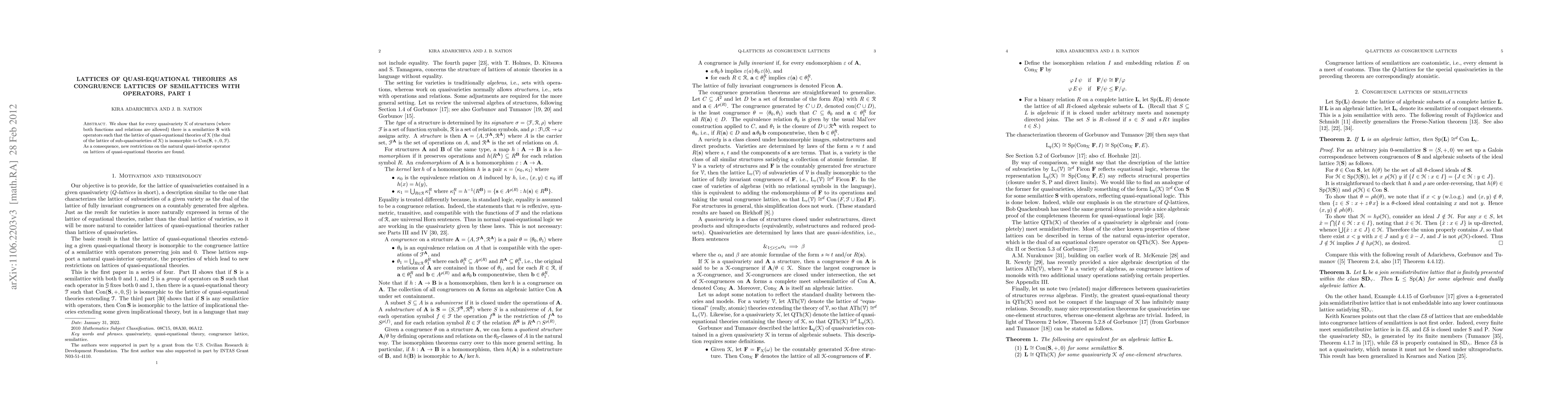 We show that for every quasivariety K of structures (where both functions and relations are allowed) there is a semilattice S with operators such that the lattice of quasi-equational theories of K (the dual of the lattice of sub-quasivarieties of K) is isomorphic to Con(S,+,0,F). As a consequence, new restrictions on the natural quasi-interior operator on lattices of quasi-equational theories are found.
