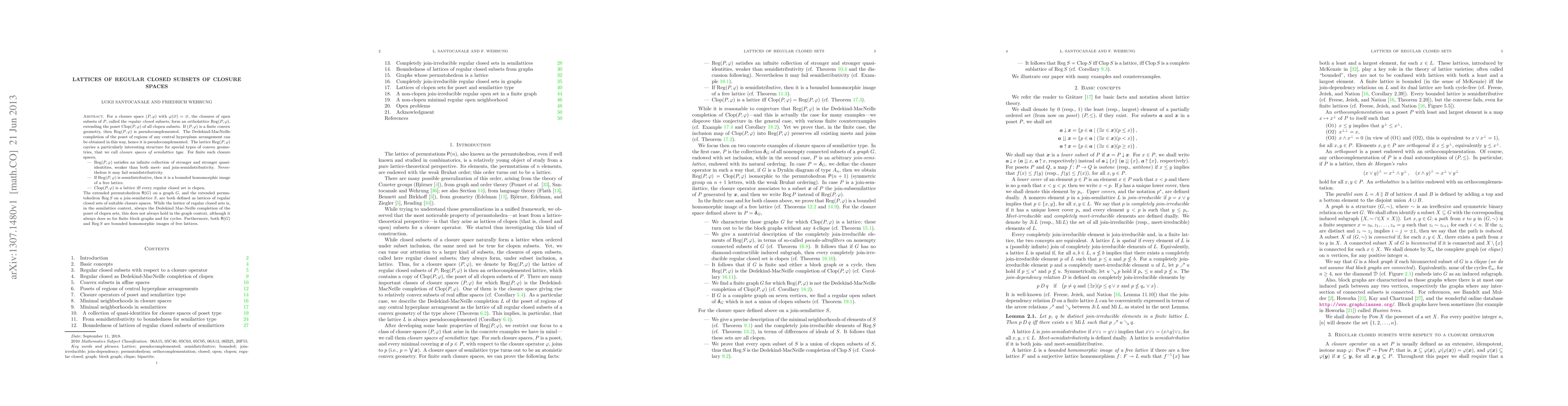 For a closure space (P,f) with f(\emptyset)=\emptyset, the closures of open subsets of P, called the regular closed subsets, form an ortholattice Reg(P,f), extending the poset Clop(P,f) of all clopen subsets. If (P,f) is a finite convex geometry, then Reg(P,f) is pseudocomplemented. The Dedekind-MacNeille completion of the poset of regions of any central hyperplane arrangement can be obtained in this way, hence it is pseudocomplemented. The lattice Reg(P,f) carries a particularly interesting structure for special types of convex geometries, that we call closure spaces of semilattice type. For finite such closure spaces, (1) Reg(P,f) satisfies an infinite collection of stronger and stronger quasi-identities, weaker than both meet- and join-semidistributivity. Nevertheless it may fail semidistributivity. (2) If Reg(P,f) is semidistributive, then it is a bounded homomorphic image of a free lattice. (3) Clop(P,f) is a lattice iff every regular closed set is clopen. The extended permutohedron R(G) on a graph G, and the extended permutohedron Reg(S) on a join-semilattice S, are both defined as lattices of regular closed sets of suitable closure spaces. While the lattice of regular closed sets is, in the semilattice context, always the Dedekind Mac-Neille completion of the poset of clopen sets, this does not always hold in the graph context, although it always does so for finite block graphs and for cycles. Furthermore, both R(G) and Reg(S) are bounded homomorphic images of free lattices.