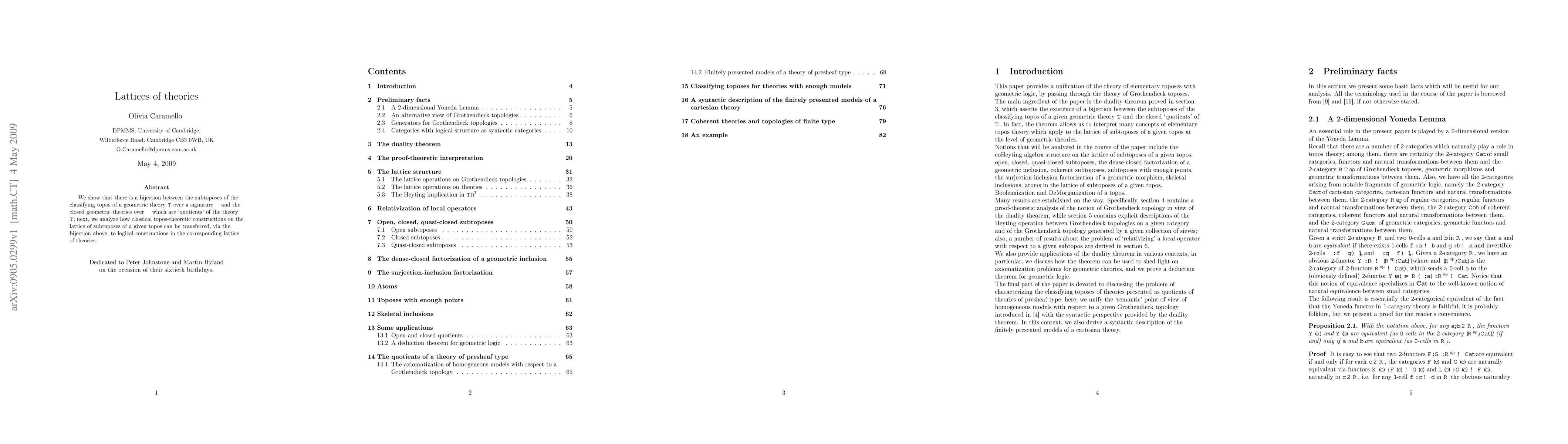We show that there is a bijection between the subtoposes of the classifying topos of a geometric theory T over a signature L and the closed geometric theories over L which are `quotients' of the theory T; next, we analyze how classical topos-theoretic constructions on the lattice of subtoposes of a given topos can be transferred, via the bijection above, to logical constructions in the corresponding lattice of theories.