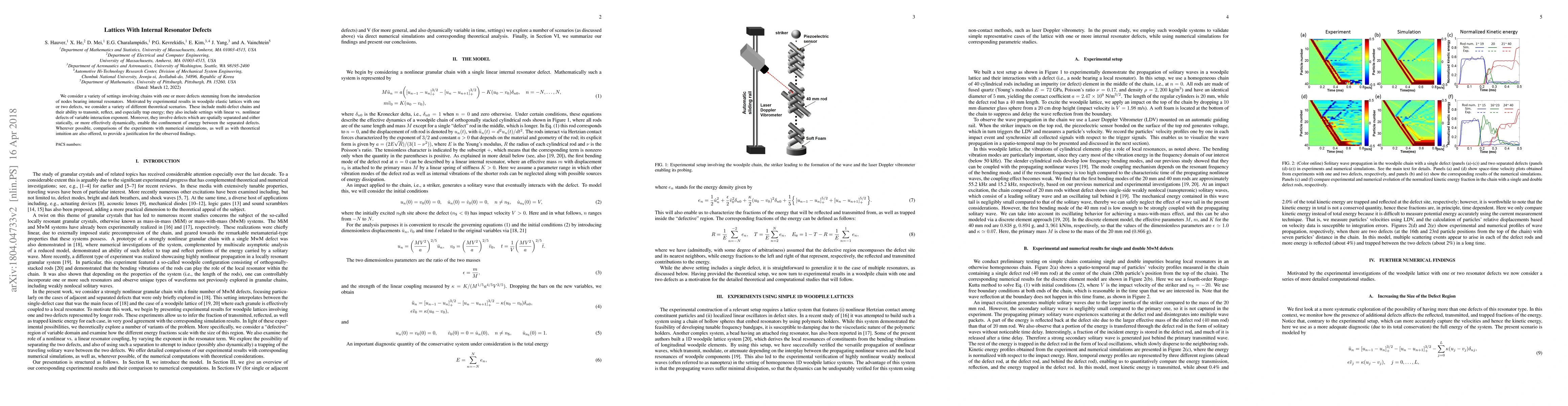We consider a variety of settings involving chains with one or more defects stemming from the introduction of nodes bearing internal resonators. Motivated by experimental results in woodpile elastic lattices with one or two defects, we consider a variety of different theoretical scenarios. These include multi-defect chains and their ability to transmit, reflect, and especially trap energy; they also include settings with linear vs. nonlinear defects of variable interaction exponent. Moreover, they involve defects which are spatially separated and either statically, or more effectively dynamically, enable the confinement of energy between the separated defects. Wherever possible, comparisons of the experiments with numerical simulations, as well as with theoretical intuition are also offered, to provide a justification for the observed findings.