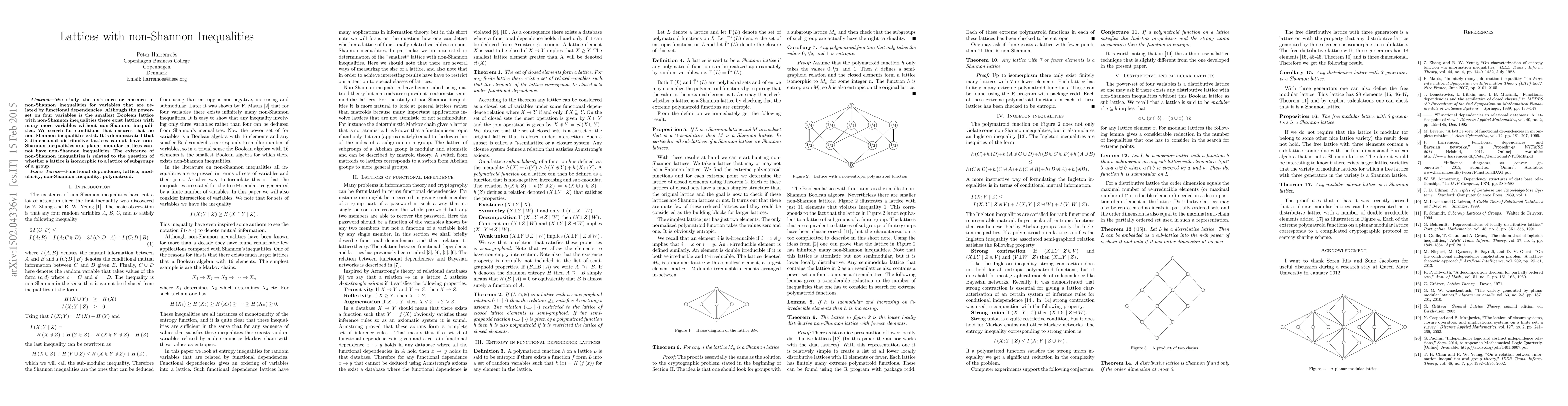 We study the existence or absence of non-Shannon inequalities for variables that are related by functional dependencies. Although the power-set on four variables is the smallest Boolean lattice with non-Shannon inequalities there exist lattices with many more variables without non-Shannon inequalities. We search for conditions that ensures that no non-Shannon inequalities exist. It is demonstrated that 3-dimensional distributive lattices cannot have non-Shannon inequalities and planar modular lattices cannot have non-Shannon inequalities. The existence of non-Shannon inequalities is related to the question of whether a lattice is isomorphic to a lattice of subgroups of a group.