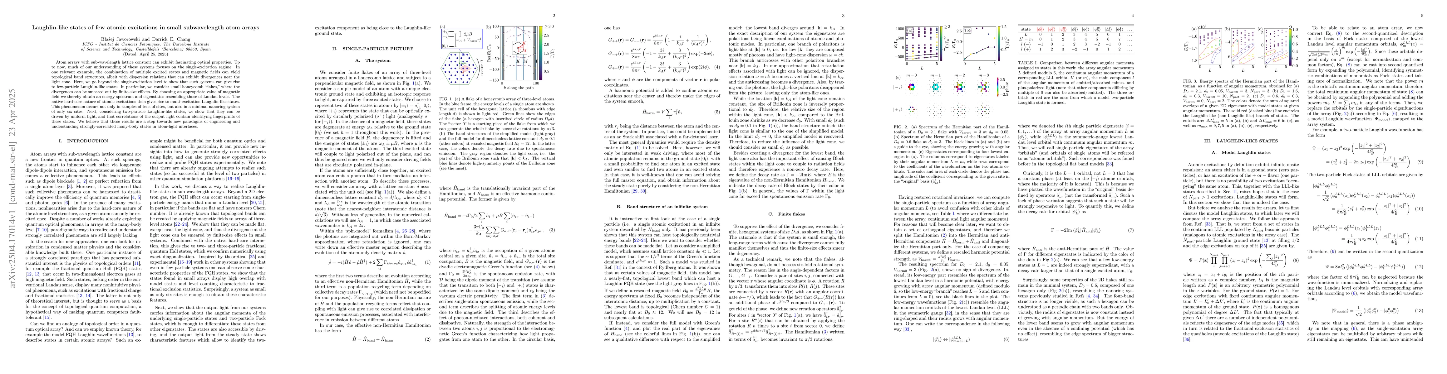 The research investigates Laughlin-like states in small subwavelength atom arrays using a combination of multiple excited states and magnetic fields, demonstrating topological band structures with smeared divergences near the light cone by considering small honeycomb 'flakes'.