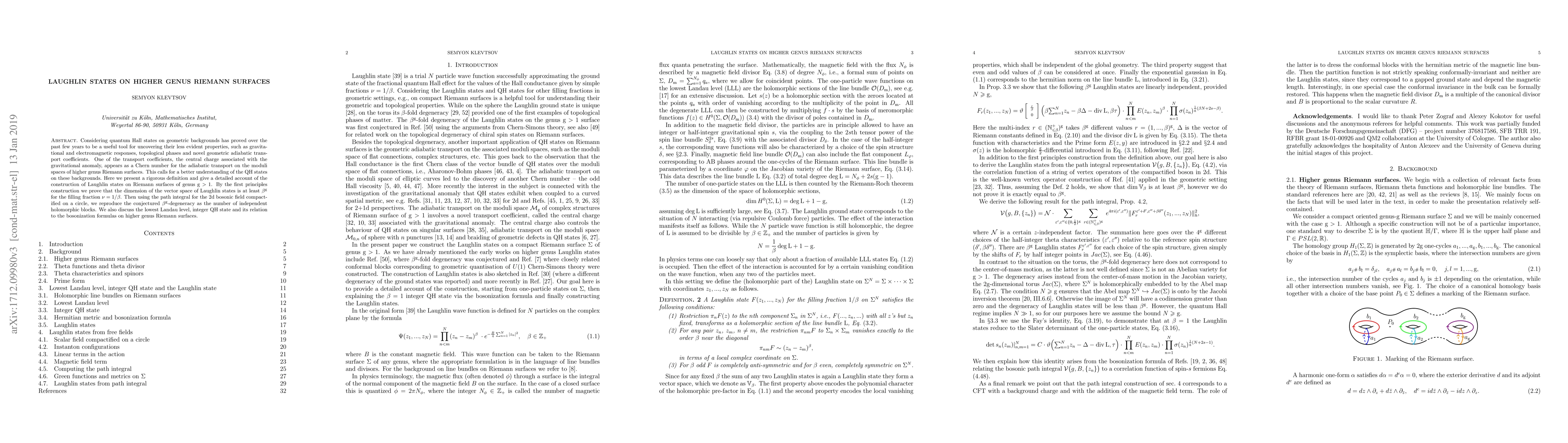This paper rigorously defines and constructs Laughlin states on Riemann surfaces of genus ${\rm g}>1$, proving their dimension to be at least $\beta^{\rm g}$ for filling fraction $\nu=1/\beta$. It also shows the $\beta^{\rm g}$-degeneracy via a 2d bosonic field path integral, and discusses the connection to the lowest Landau level and integer quantum Hall states.