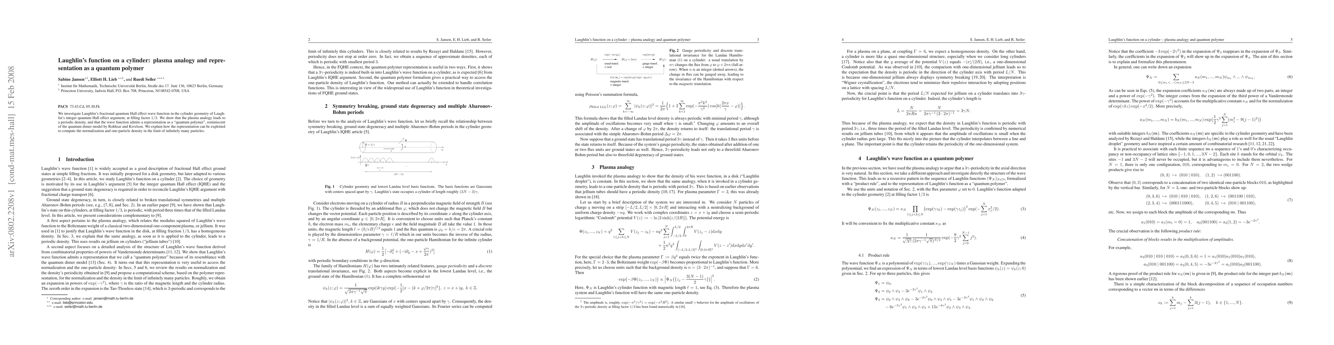 Summary: This paper explores Laughlin's wave function in cylindrical geometry at filling factor 1/3, revealing a periodic density via plasma analogy and representing it as a "quantum polymer." The study demonstrates how this representation aids in computing normalization and one-particle density in the limit of infinite particles.
