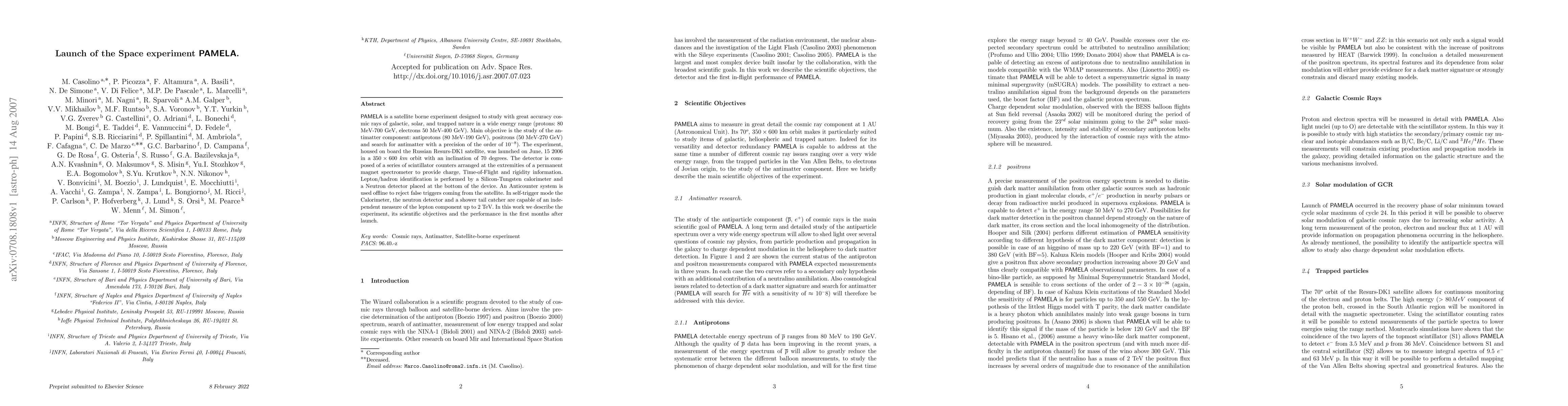 PAMELA is a satellite experiment launched to study cosmic rays with high precision, focusing on antimatter components like antiprotons and positrons. The experiment, launched in 2006, uses a sophisticated detector system to analyze particles in a wide energy range, aiming for a detection precision of 10^-8.