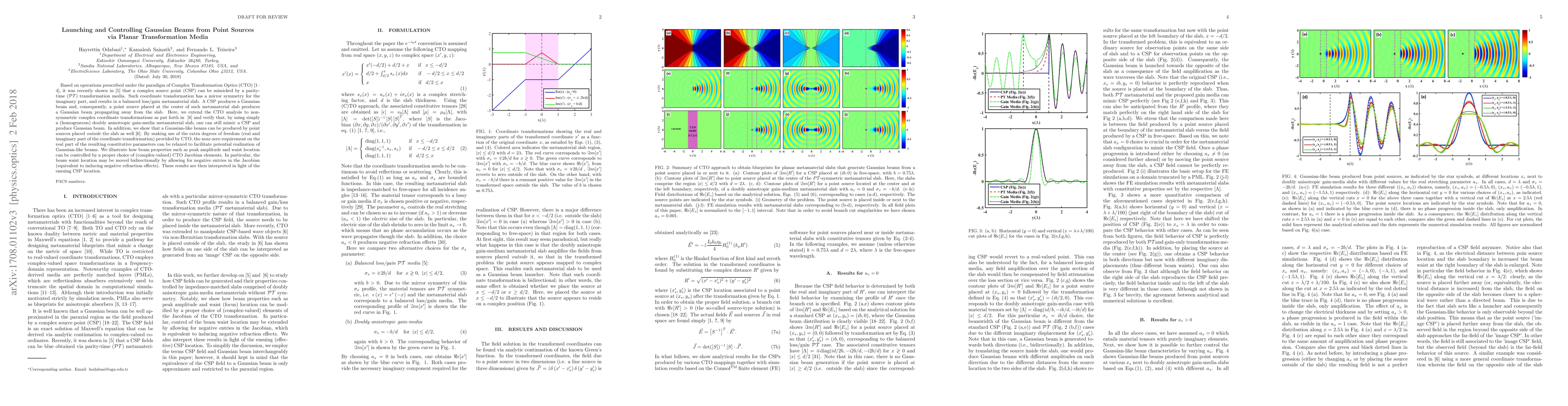 Based on operations prescribed under the paradigm of Complex Transformation Optics (CTO) [1-5], it was recently shown in [5] that a complex source point (CSP) can be mimicked by a parity-time ($\mathcal{PT}$) transformation media. Such coordinate transformation has a mirror symmetry for the imaginary part, and results in a balanced loss/gain metamaterial slab. A CSP produces a Gaussian beam and, consequently, a point source placed at the center of such metamaterial slab produces a Gaussian beam propagating away from the slab. Here, we extend the CTO analysis to non-symmetric complex coordinate transformations as put forth in [6] and verify that, by using simply a (homogeneous) doubly anisotropic gain-media metamaterial slab, one can still mimic a CSP and produce Gaussian beam. In addition, we show that a Gaussian-like beams can be produced by point sources placed {\it outside} the slab as well [6]. By making use of the extra degrees of freedom (real and imaginary part of the coordinate transformation) provided by CTO, the near-zero requirement on the real part of the resulting constitutive parameters can be relaxed to facilitate potential realization of Gaussian-like beams. We illustrate how beam properties such as peak amplitude and waist location can be controlled by a proper choice of (complex-valued) CTO Jacobian elements. In particular, the beam waist location may be moved bidirectionally by allowing for negative entries in the Jacobian (equivalent to inducing negative refraction effects). These results are then interpreted in light of the ensuing CSP location.