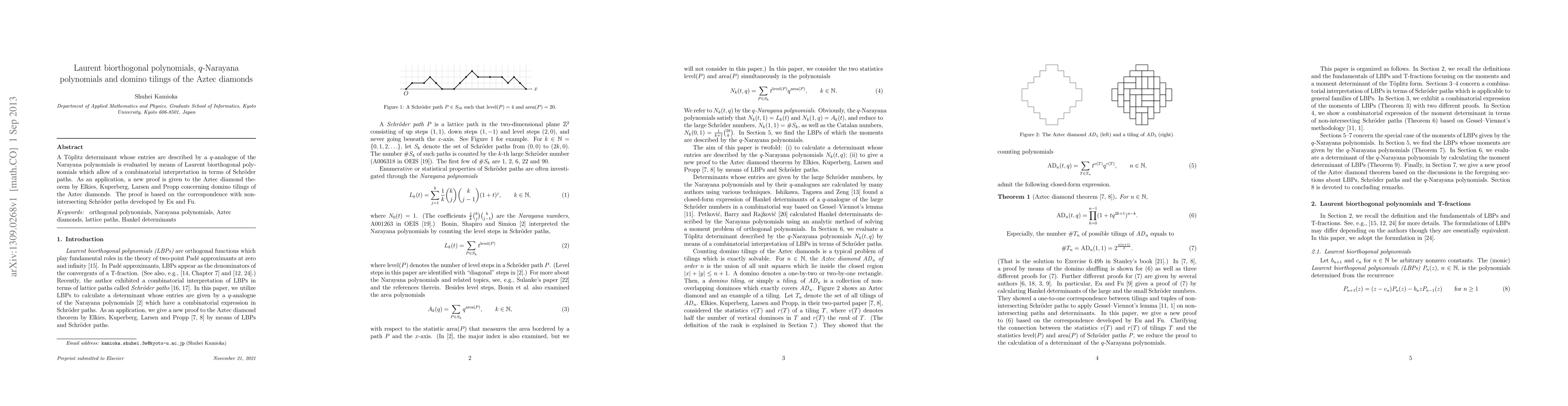 A T\"oplitz determinant whose entries are described by a q-analogue of the Narayana polynomials is evaluated by means of Laurent biorthogonal polynomials which allow of a combinatorial interpretation in terms of Schr\"oder paths. As an application, a new proof is given to the Aztec diamond theorem by Elkies, Kuperberg, Larsen and Propp concerning domino tilings of the Aztec diamonds. The proof is based on the correspondence with non-intersecting Schr\"oder paths developed by Eu and Fu.