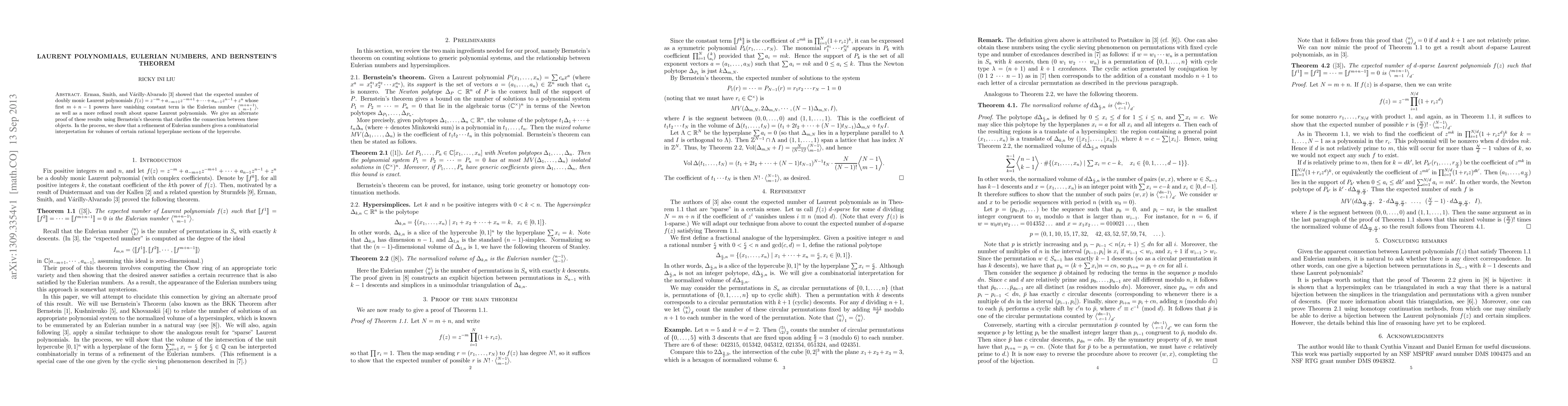 Erman, Smith, and V\'arilly-Alvarado showed that the expected number of doubly monic Laurent polynomials $f(z) = z^{-m} + a_{-m+1}z^{-m+1} + \cdots + a_{n-1}z^{n-1} + z^n$ whose first $m+n-1$ powers have vanishing constant term is the Eulerian number $\brac{m+n-1}{m-1}$, as well as a more refined result about sparse Laurent polynomials. We give an alternate proof of these results using Bernstein's theorem that clarifies the connection between these objects. In the process, we show that a refinement of Eulerian numbers gives a combinatorial interpretation for volumes of certain rational hyperplane sections of the hypercube.