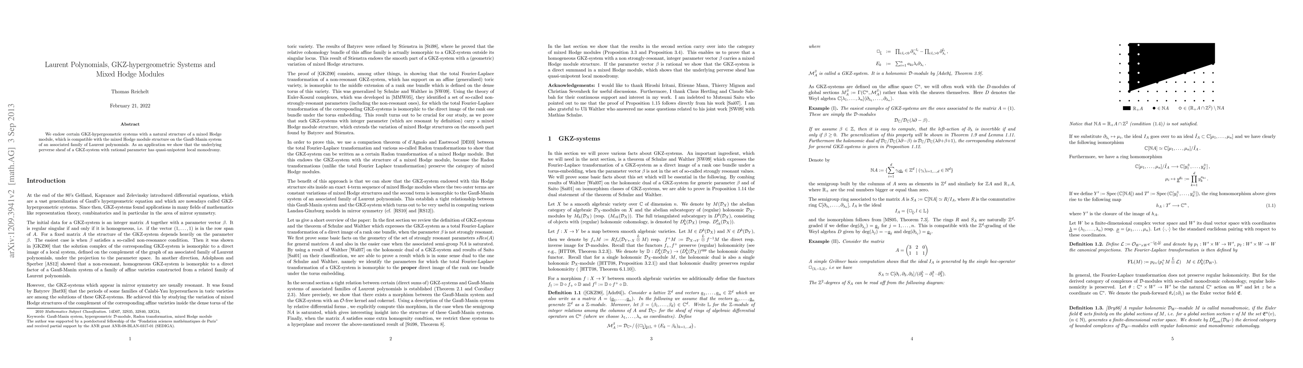 This paper constructs a morphism linking the Gauss-Manin system of a family of Laurent polynomials to a direct sum of GKZ systems, revealing simple kernel and cokernel structures. It also establishes a mixed Hodge module structure on certain GKZ systems, demonstrating quasi-unipotent monodromy.