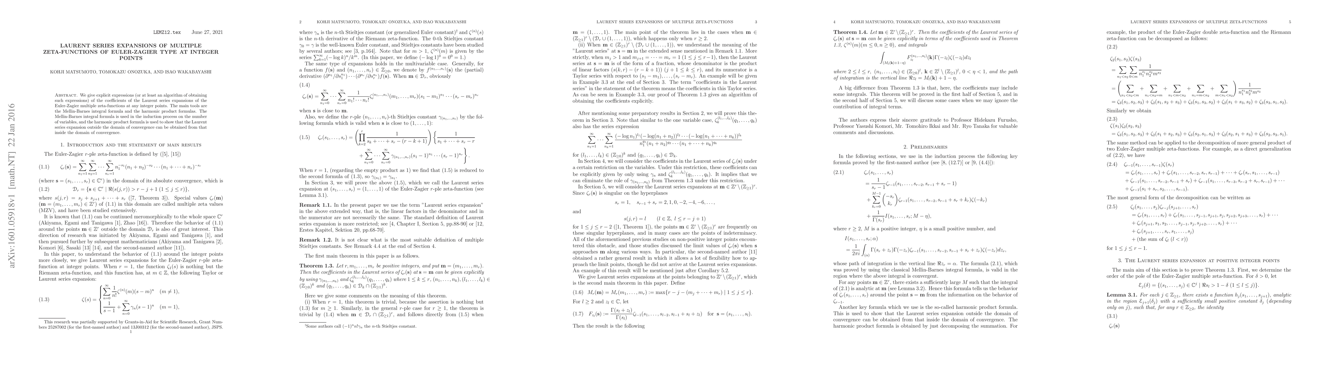 This paper provides explicit expressions or an algorithm to derive coefficients of Laurent series expansions for Euler-Zagier multiple zeta-functions at integer points. It employs the Mellin-Barnes integral formula and harmonic product formulas, using the former in induction on variables and the latter to extend series beyond their initial convergence domain.