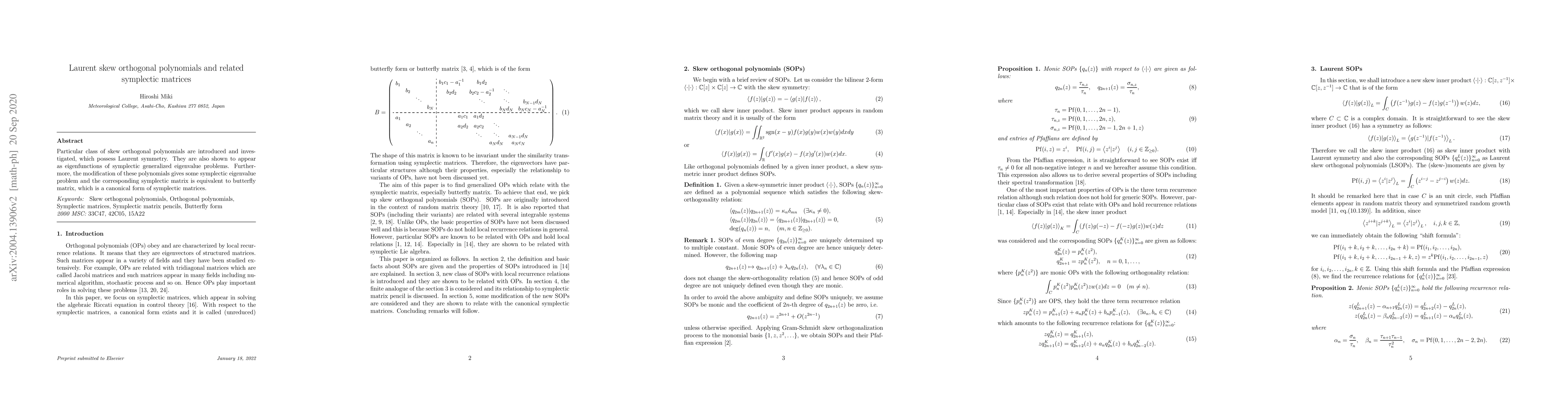 This paper introduces Laurent skew orthogonal polynomials with a focus on their symmetry properties and demonstrates their role as eigenfunctions of symplectic generalized eigenvalue problems. It also reveals their connection to symplectic matrices, specifically showing the equivalence of a modified form to the butterfly matrix, a canonical form of symplectic matrices.