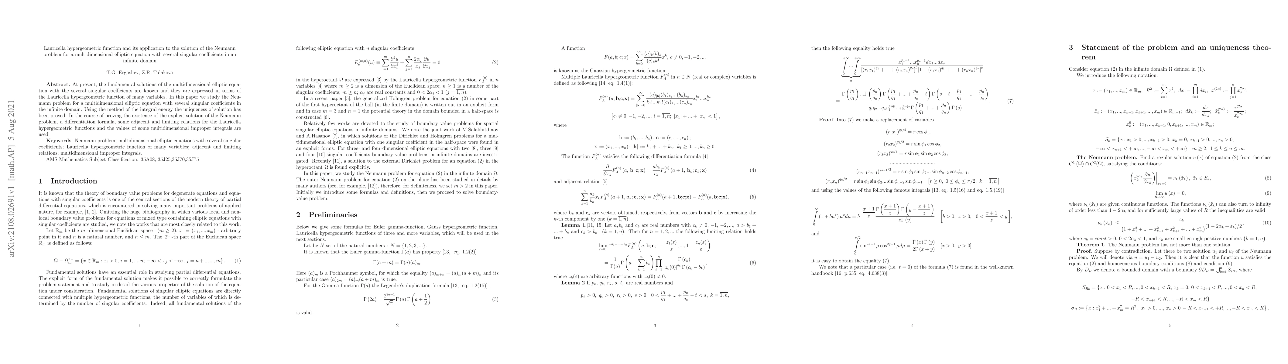 This paper investigates the Neumann problem for a multidimensional elliptic equation with singular coefficients in an infinite domain, proving the uniqueness of the solution using the integral energy method. It derives an explicit solution utilizing the Lauricella hypergeometric function and associated differentiation and limiting relations.