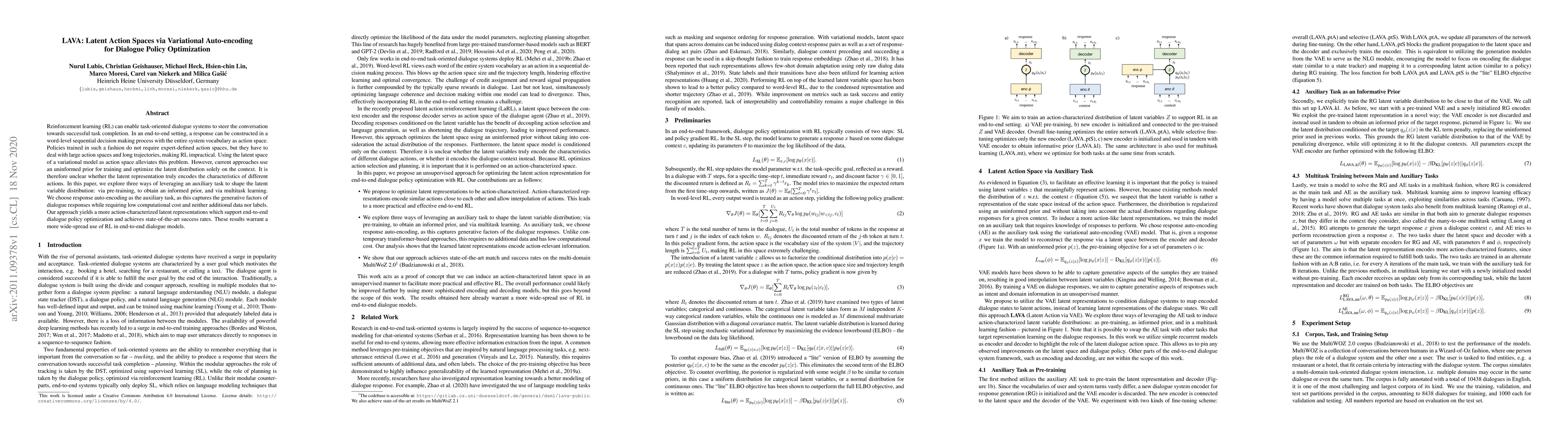 Reinforcement learning (RL) can enable task-oriented dialogue systems to steer the conversation towards successful task completion. In an end-to-end setting, a response can be constructed in a word-level sequential decision making process with the entire system vocabulary as action space. Policies trained in such a fashion do not require expert-defined action spaces, but they have to deal with large action spaces and long trajectories, making RL impractical. Using the latent space of a variational model as action space alleviates this problem. However, current approaches use an uninformed prior for training and optimize the latent distribution solely on the context. It is therefore unclear whether the latent representation truly encodes the characteristics of different actions. In this paper, we explore three ways of leveraging an auxiliary task to shape the latent variable distribution: via pre-training, to obtain an informed prior, and via multitask learning. We choose response auto-encoding as the auxiliary task, as this captures the generative factors of dialogue responses while requiring low computational cost and neither additional data nor labels. Our approach yields a more action-characterized latent representations which support end-to-end dialogue policy optimization and achieves state-of-the-art success rates. These results warrant a more wide-spread use of RL in end-to-end dialogue models.