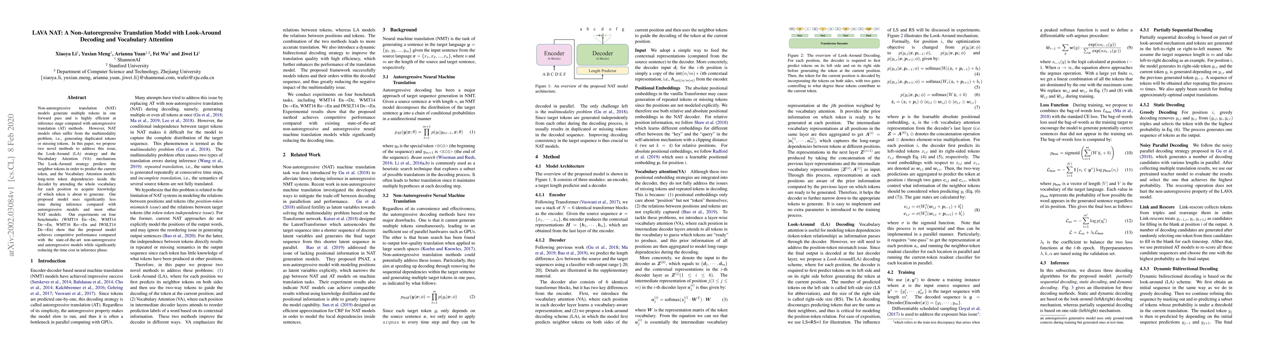 This paper introduces LAVA NAT, a non-autoregressive translation model that employs Look-Around decoding and Vocabulary Attention to address multimodality issues. The model achieves competitive translation quality while significantly reducing inference time compared to autoregressive and other non-autoregressive models.