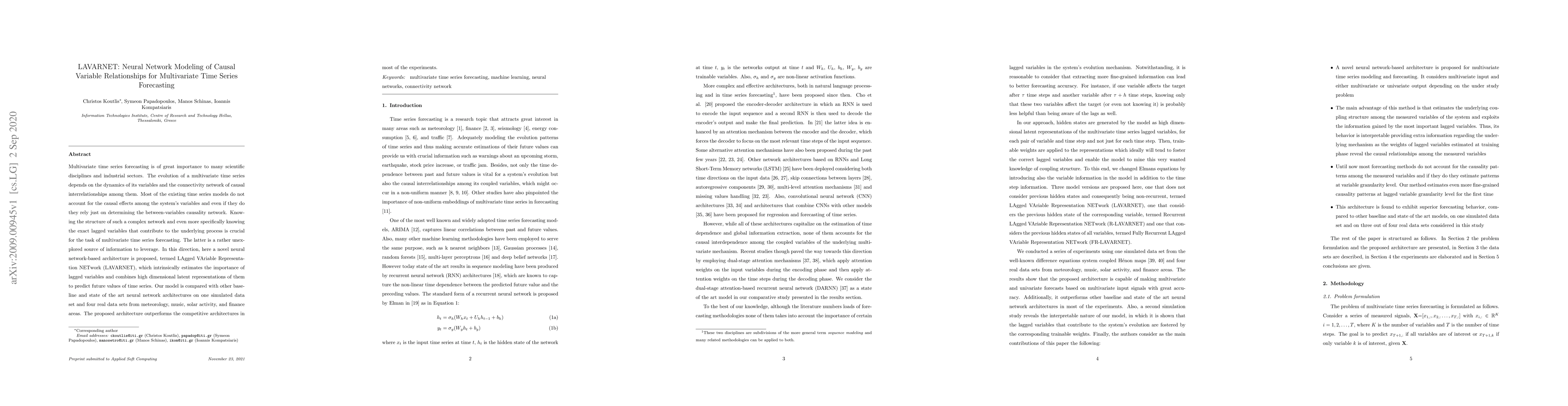 LAVARNET is a novel neural network architecture designed to model causal variable relationships in multivariate time series forecasting, outperforming other models by leveraging the importance of lagged variables. The method was tested on simulated and real datasets from meteorology, music, solar activity, and finance.