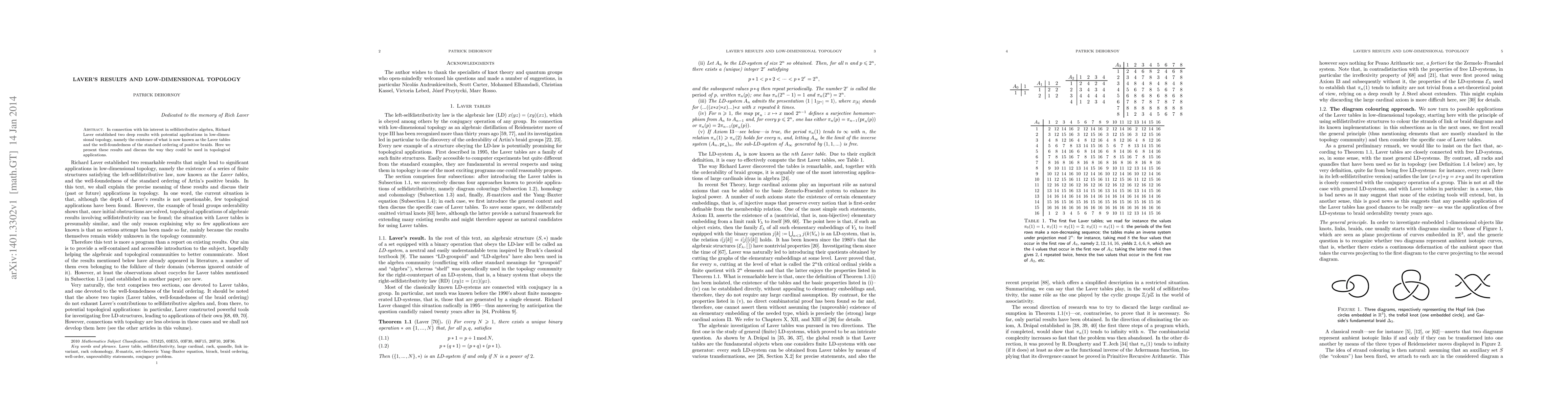 The paper primarily analyzes Laver's results in the context of low-dimensional topology, focusing on the existence of Laver tables and the well-foundedness of the standard ordering of positive braids.