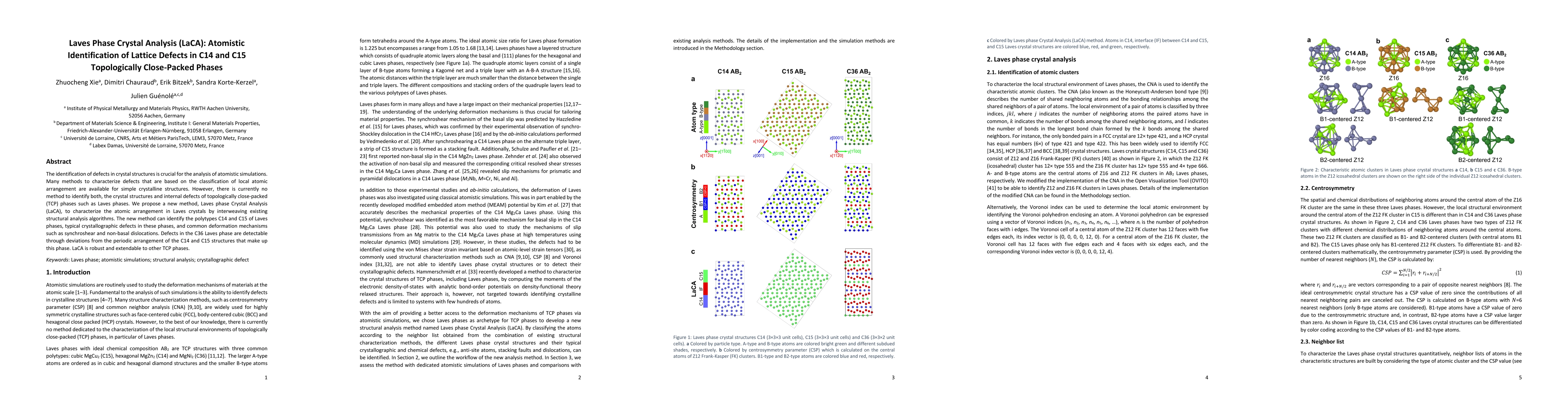 This paper introduces Laves phase Crystal Analysis (LaCA), a new method for identifying lattice defects in the C14 and C15 Laves phases, which are topologically close-packed structures. LaCA integrates existing structural analysis algorithms to detect crystal defects and deformation mechanisms, offering a robust and extendable approach for analyzing other TCP phases.