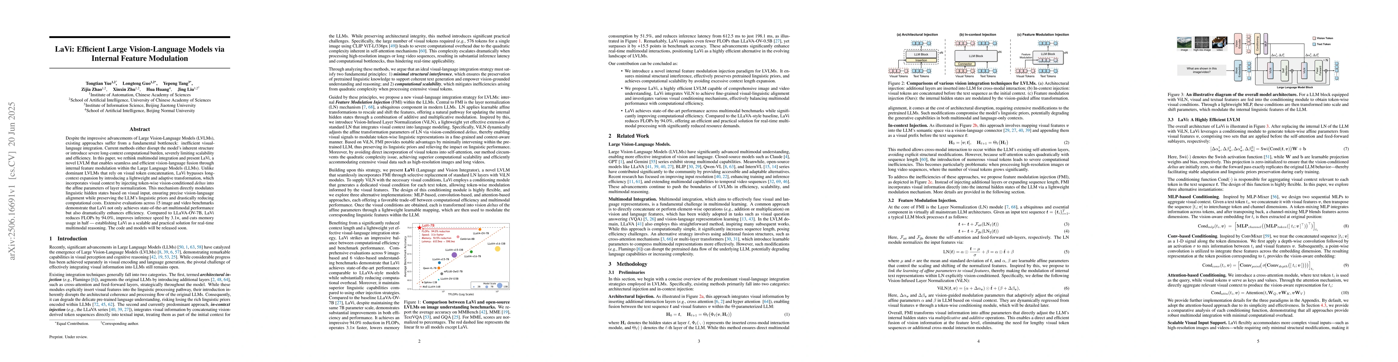 Despite the impressive advancements of Large Vision-Language Models (LVLMs), existing approaches suffer from a fundamental bottleneck: inefficient visual-language integration. Current methods either disrupt the model's inherent structure or introduce severe long-context computational burden, severely limiting scalability and efficiency. In this paper, we rethink multimodal integration and present LaVi, a novel LVLM that enables seamless and efficient vision-language fusion through internal feature modulation within the Large Language Models (LLMs). Unlike dominant LVLMs that rely on visual token concatenation, LaVi bypasses long-context expansion by introducing a lightweight and adaptive transformation, which incorporates visual context by injecting token-wise vision-conditioned deltas into the affine parameters of layer normalization. This mechanism directly modulates linguistic hidden states based on visual input, ensuring precise vision-language alignment while preserving the LLM's linguistic priors and drastically reducing computational costs. Extensive evaluations across 15 image and video benchmarks demonstrate that LaVi not only achieves state-of-the-art multimodal performance but also dramatically enhances efficiency. Compared to LLaVA-OV-7B, LaVi reduces FLOPs by 94.0%, improves inference speed by 3.1 times, and cuts memory usage in half - establishing LaVi as a scalable and practical solution for real-time multimodal reasoning. The code and models will be released soon.