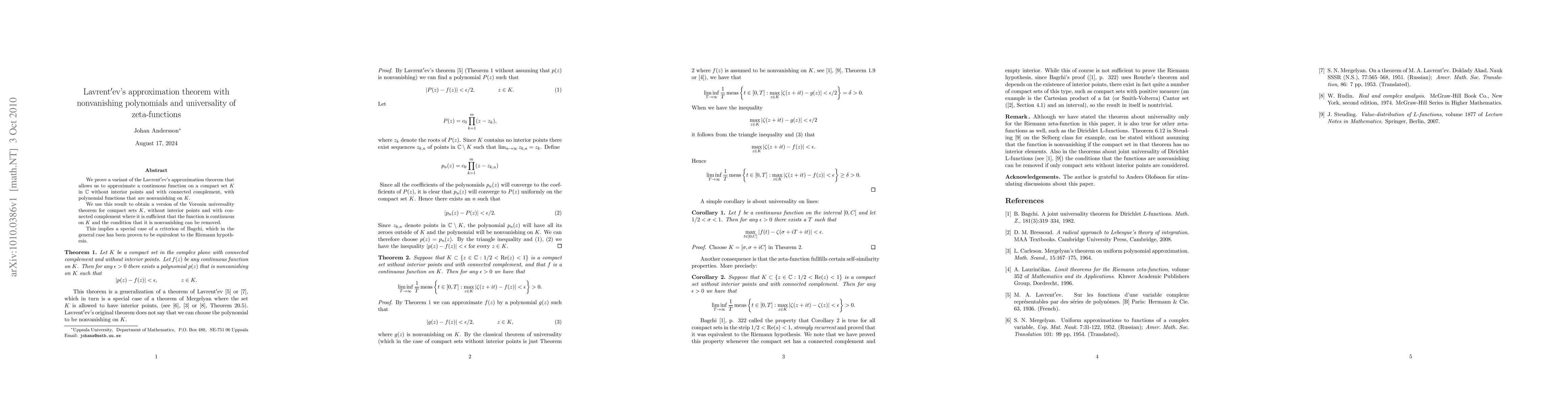 We prove a variant of the Lavrentiev's approximation theorem that allows us to approximate a continuous function on a compact set K in C without interior points and with connected complement, with polynomial functions that are nonvanishing on K. We use this result to obtain a version of the Voronin universality theorem for compact sets K, without interior points and with connected complement where it is sufficient that the function is continuous on K and the condition that it is nonvanishing can be removed. This implies a special case of a criterion of Bagchi, which in the general case has been proven to be equivalent to the Riemann hypothesis.