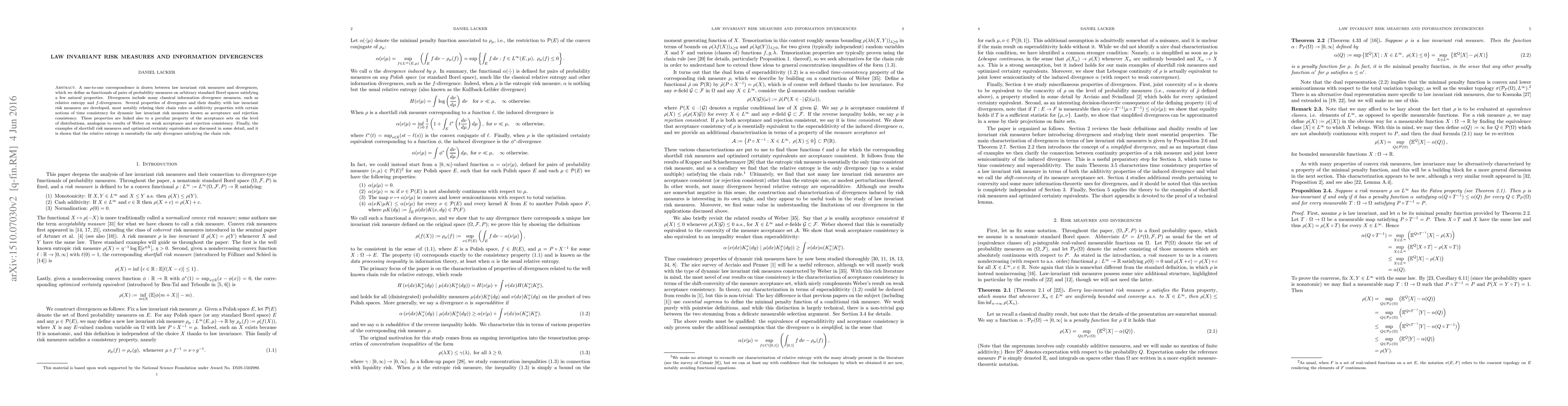 This paper establishes a one-to-one correspondence between law invariant risk measures and information divergences, exploring their properties and dual relationships. It highlights the connection between divergences' chain rules and time consistency in dynamic risk measures, and discusses specific examples like shortfall risk measures and optimized certainty equivalents.