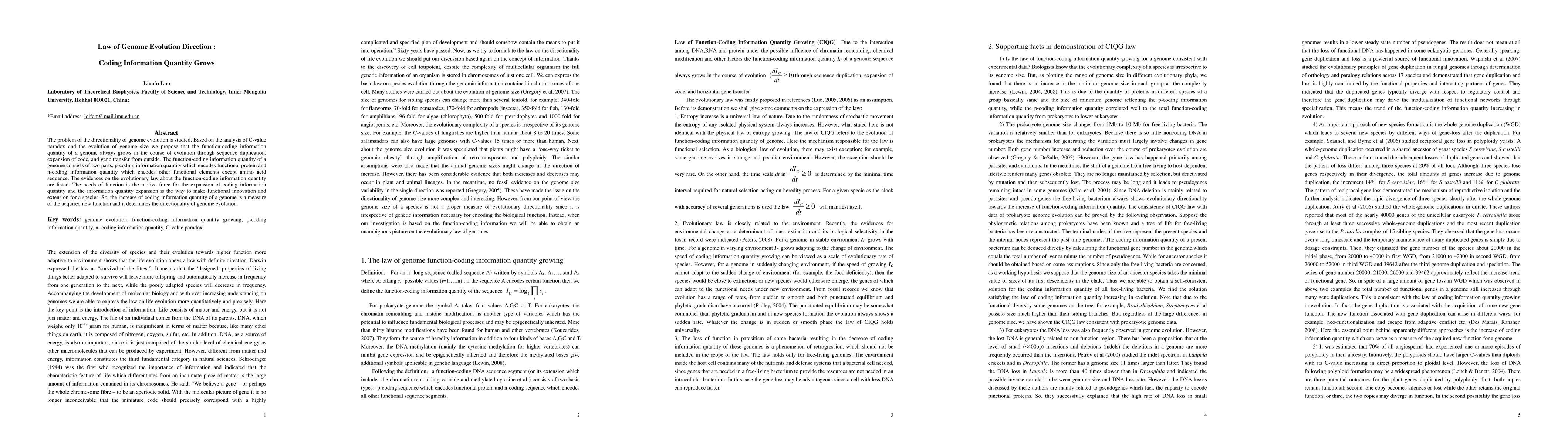 The problem of the directionality of genome evolution is studied. Based on the analysis of C-value paradox and the evolution of genome size we propose that the function-coding information quantity of a genome always grows in the course of evolution through sequence duplication, expansion of code, and gene transfer from outside. The function-coding information quantity of a genome consists of two parts, p-coding information quantity which encodes functional protein and n-coding information quantity which encodes other functional elements except amino acid sequence. The evidences on the evolutionary law about the function-coding information quantity are listed. The needs of function is the motive force for the expansion of coding information quantity and the information quantity expansion is the way to make functional innovation and extension for a species. So, the increase of coding information quantity of a genome is a measure of the acquired new function and it determines the directionality of genome evolution.