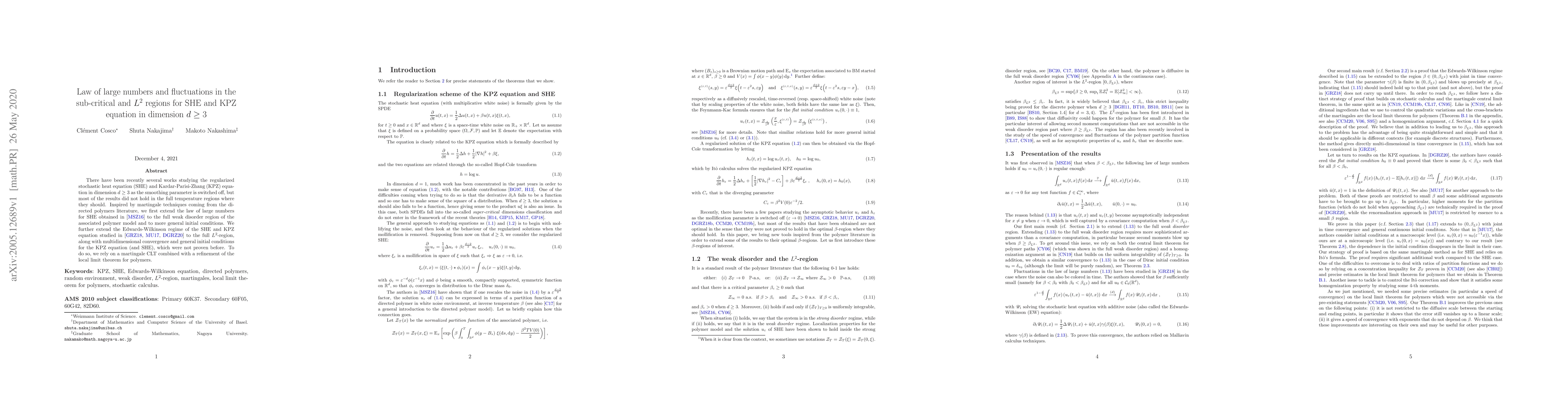 This paper extends the law of large numbers for the stochastic heat equation (SHE) and the Kardar-Parisi-Zhang (KPZ) equation to full weak disorder and $L^2$ regions, using martingale techniques from directed polymers. It also proves multidimensional convergence and general initial conditions for the KPZ equation, previously unproven.