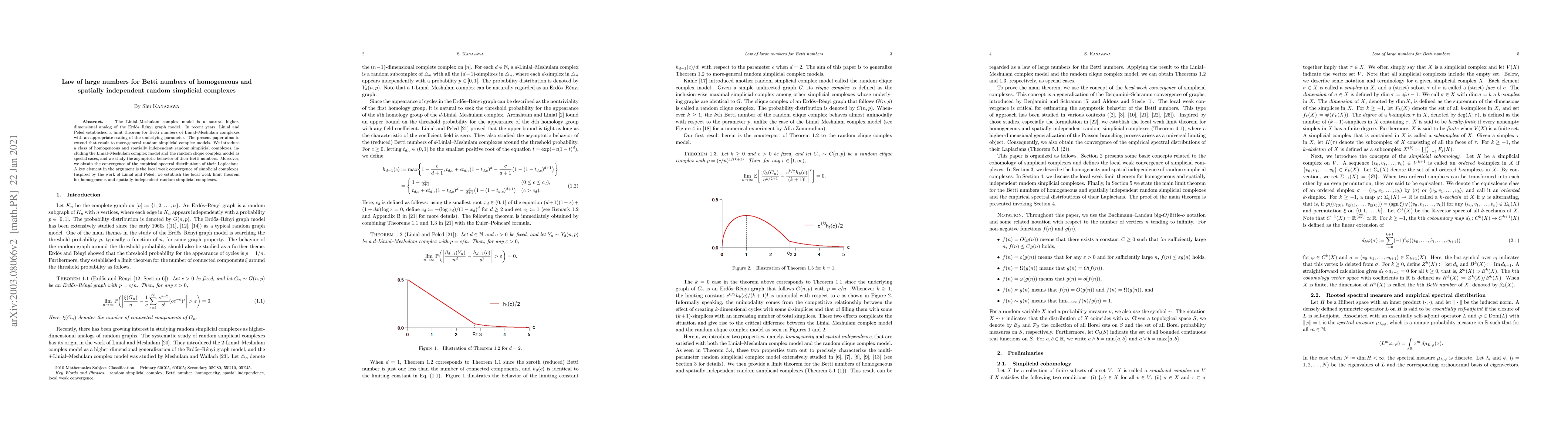 The work extends previous results by Linial and Peled, offering a more general approach to the study of Betti numbers and spectral distributions in random simplicial complexes, thereby contributing novel insights into their asymptotic behavior.