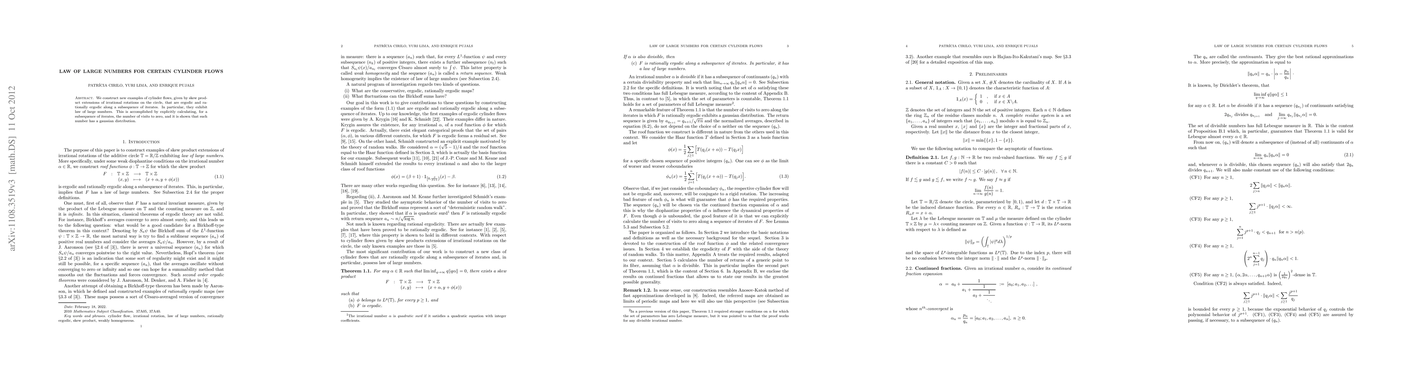 Researchers found a new class of cylinder flows that exhibit law of large numbers, where the number of visits to zero follows a Gaussian distribution.