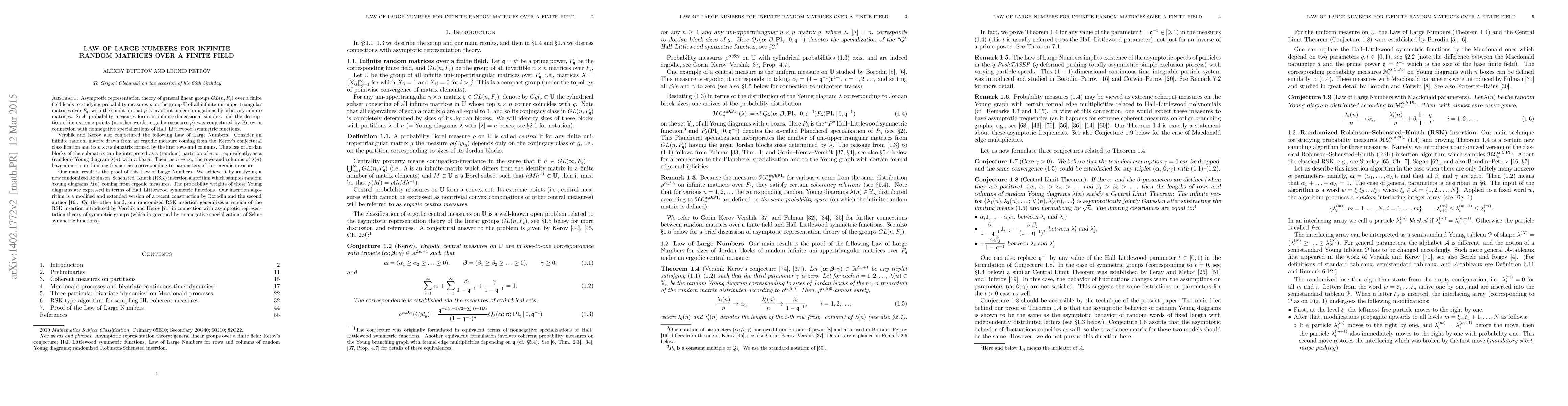 Researchers prove a 'Law of Large Numbers' for infinite random matrices over finite fields, showing that as matrix size increases, the rows and columns of generated Young diagrams have almost sure limiting frequencies corresponding to the underlying probability measure.