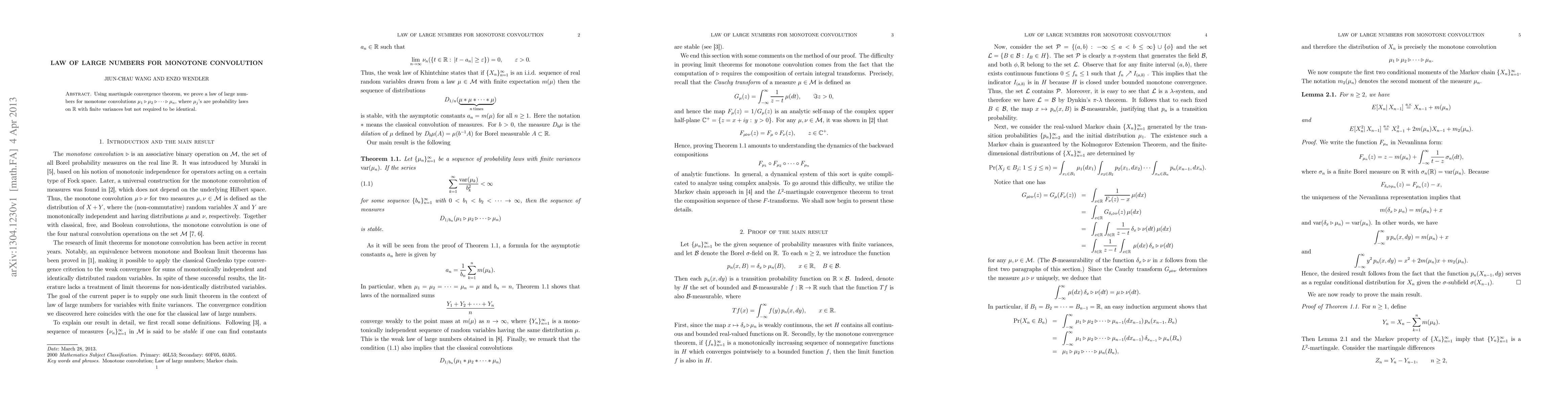 This paper proves a law of large numbers for monotone convolutions of probability laws on $\mathbb{R}$ using the martingale convergence theorem, showing that the average of these convolutions converges to a limit with finite variance.